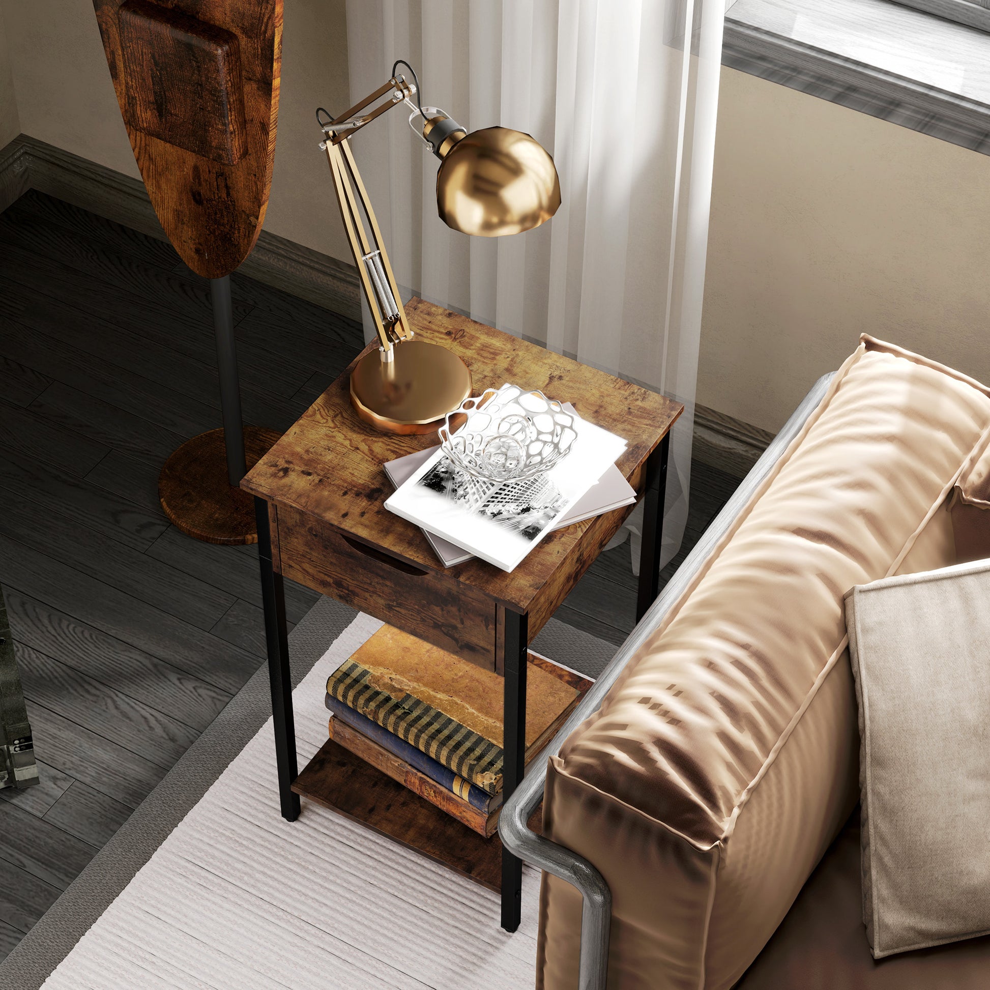 HOMCOM Beistelltisch im Industriestil, Schublade, Ablagefach, Metallrahmen, Holz, 40 x 40 x 68 cm, Braun