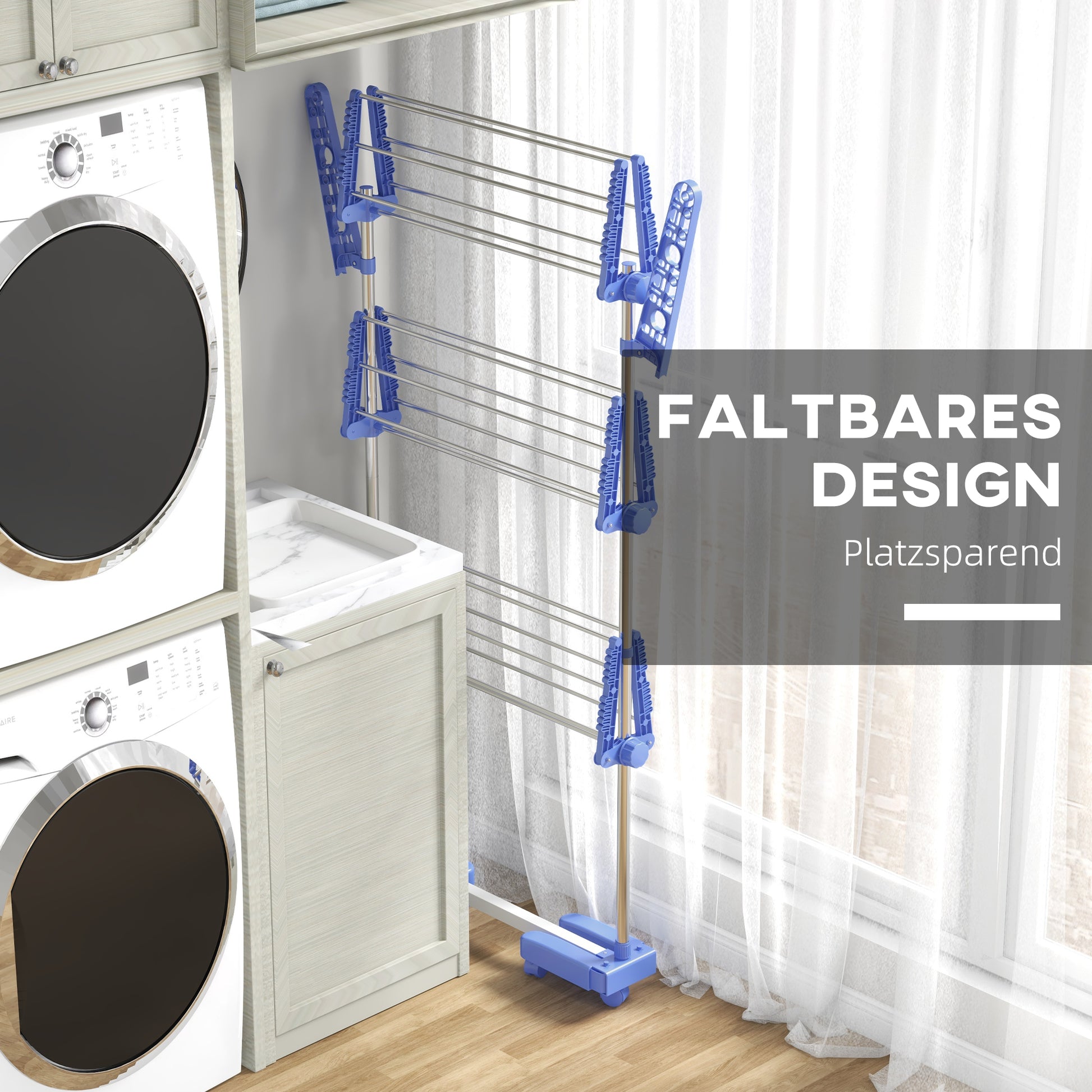 HOMCOM Wäschenständer Wäschetrockner. 4 Ebenen, klappbar, One-Klick-System, 142 cm x 55 cm x 152 cm Blau + Silber
