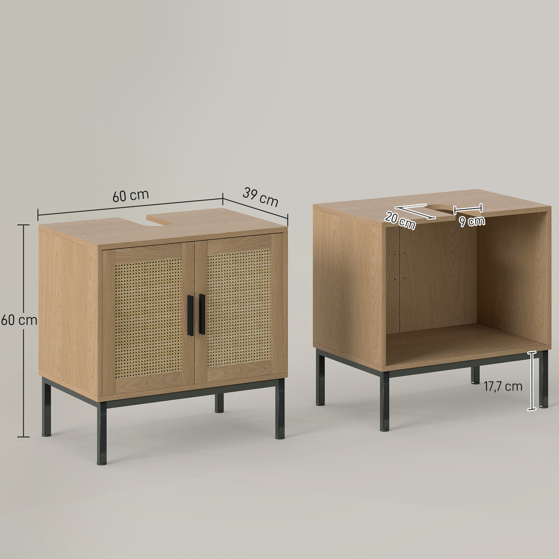 kleankin Badezimmerunterschrank, im Boho-Design, Badezimmerschrank, Rattan-Elemente, mit U-Ausschnitt, Eiche