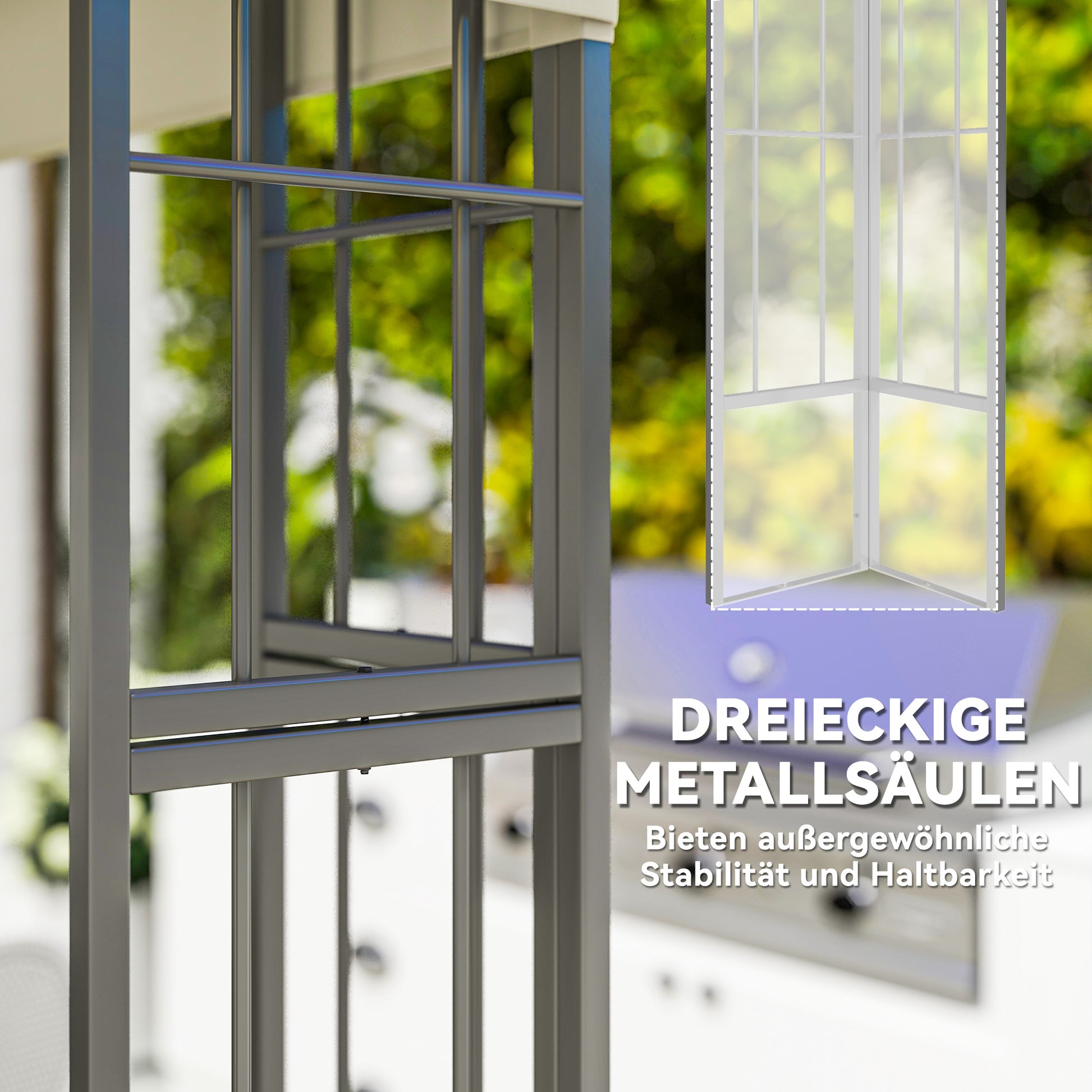 Die stabilen, pulverbeschichteten Metallsäulen des Outsunny wetterfesten Gartenpavillions bieten hervorragenden Schutz vor Witterungen und das elegante, zweistufige Dach des Pavillons verbessert die Luftzirkulation. Das Kunststoff-beschichtete Dach des Pavillons schirmt 97% der UV-Strahlen ab und sorgt für angenehm kühlen Sonnenschutz an warmen Sommertagen.