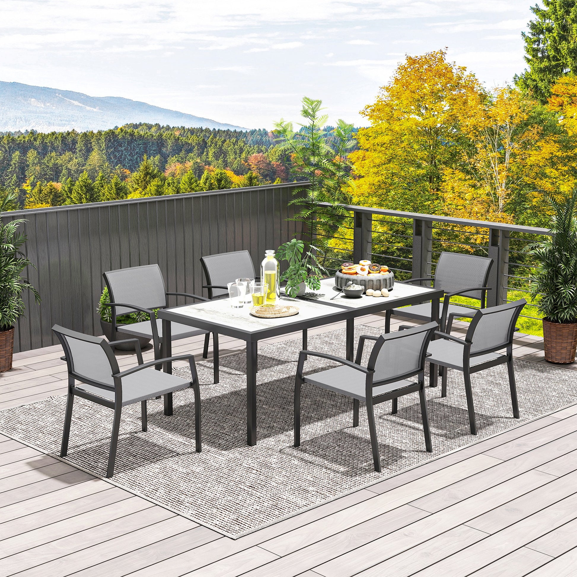 Outsunny 7-teiliges Ess-Set, 6 Stühle, 1 Tisch, stapelbar, leicht zu reinigen, Stahlrahmen, Gartenmöbel-Set, Grau