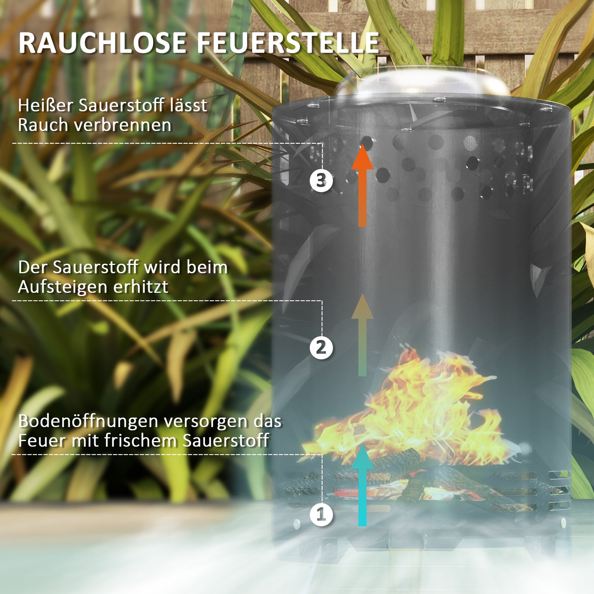 Entdecken Sie die elegante und nützliche Outsunny Feuerschale für den Garten im modernen Design. Diese aus pulverbeschichtetem Edelstahl gefertigte Feuerstelle bietet nicht nur Robustheit und hohe Hitzebeständigkeit, sondern auch ein ansprechendes Zylinderdesign. Dieses innovative, rauchfreie Sekundärverbrennungssystem der Feuerschale ermöglicht durch Sauerstoffzufuhr von unten und Kanäle zwischen den Wänden eine effiziente und starke Verbrennung, die den Brennstoff vollständig zu Asche verbrennt. Erleben Sie Wärme auf eine ganz neue Art!
