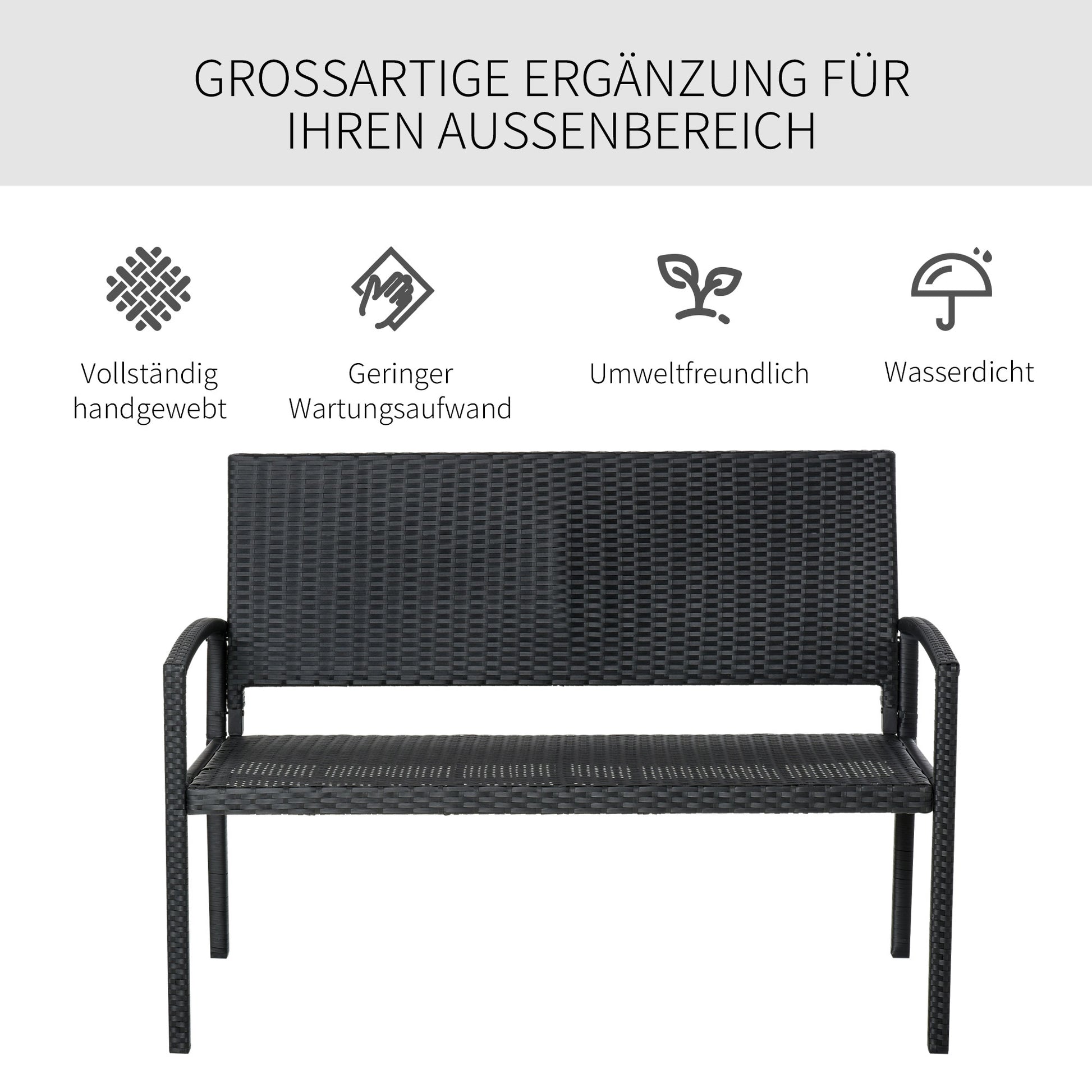 Für entspannte Momente im heimischen Grün ist unsere Polyrattanbank von Outsunny eine ausgezeichnete Wahl. Die Gartenbank verfügt über einen robusten Stahlrahmen, während Sitz und Rücklehne aus handgeflochtenem Kunstrattan bestehen, der für einen hohen Sitzkomfort und eine optimale Witterungsbeständigkeit sorgt. Somit können sich bis zu zwei Personen hier bequem niederlassen und eine wundervolle, entspannte Zeit im Freien verbringen. Heißen Sie die warmen Sommertage willkommen!