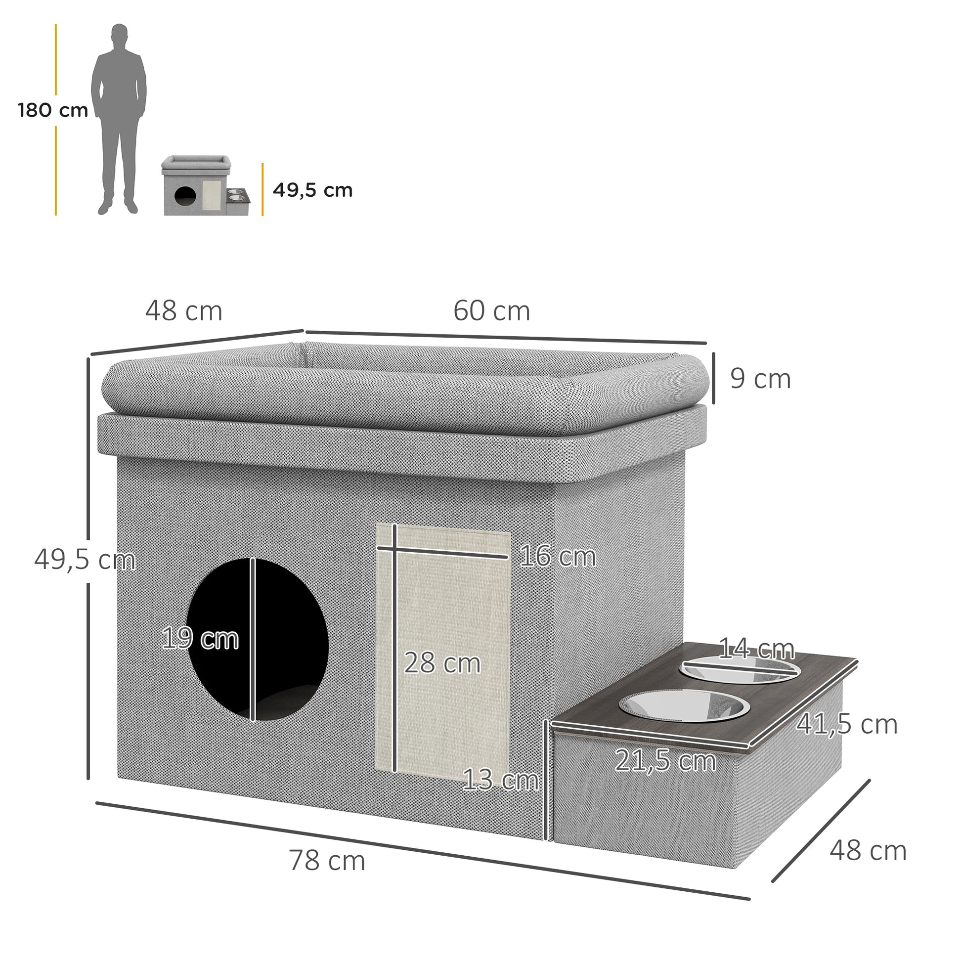 PawHut Katzenhaus, Futterplatz mit 2 Edelstahlnäpfen, Kratzmatte, weiches Liegekissen, 78 x 48 x 49,5 cm, grau