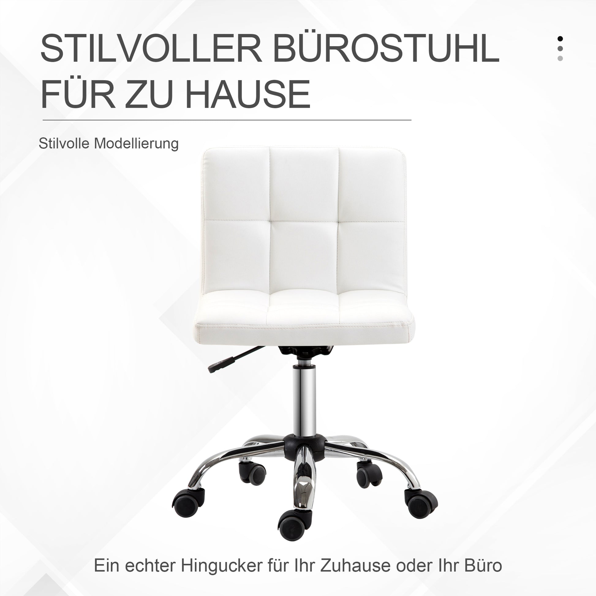 Schlicht und raffiniert – so präsentiert sich der elegante, ergonomische Computerstuhl. Sein Design mit einer Stahlstruktur und einer Abdeckung aus weißem Kunstleder bietet einen minimalistischen Look, perfekt für jede Einrichtung. Neben dem Stil ist der PC Stuhl funktional gestaltet: Der höhenverstellbare Sitz und die leise, drehbare Basis mit 5 Nylonrädern sorgen für Komfort und Beweglichkeit.