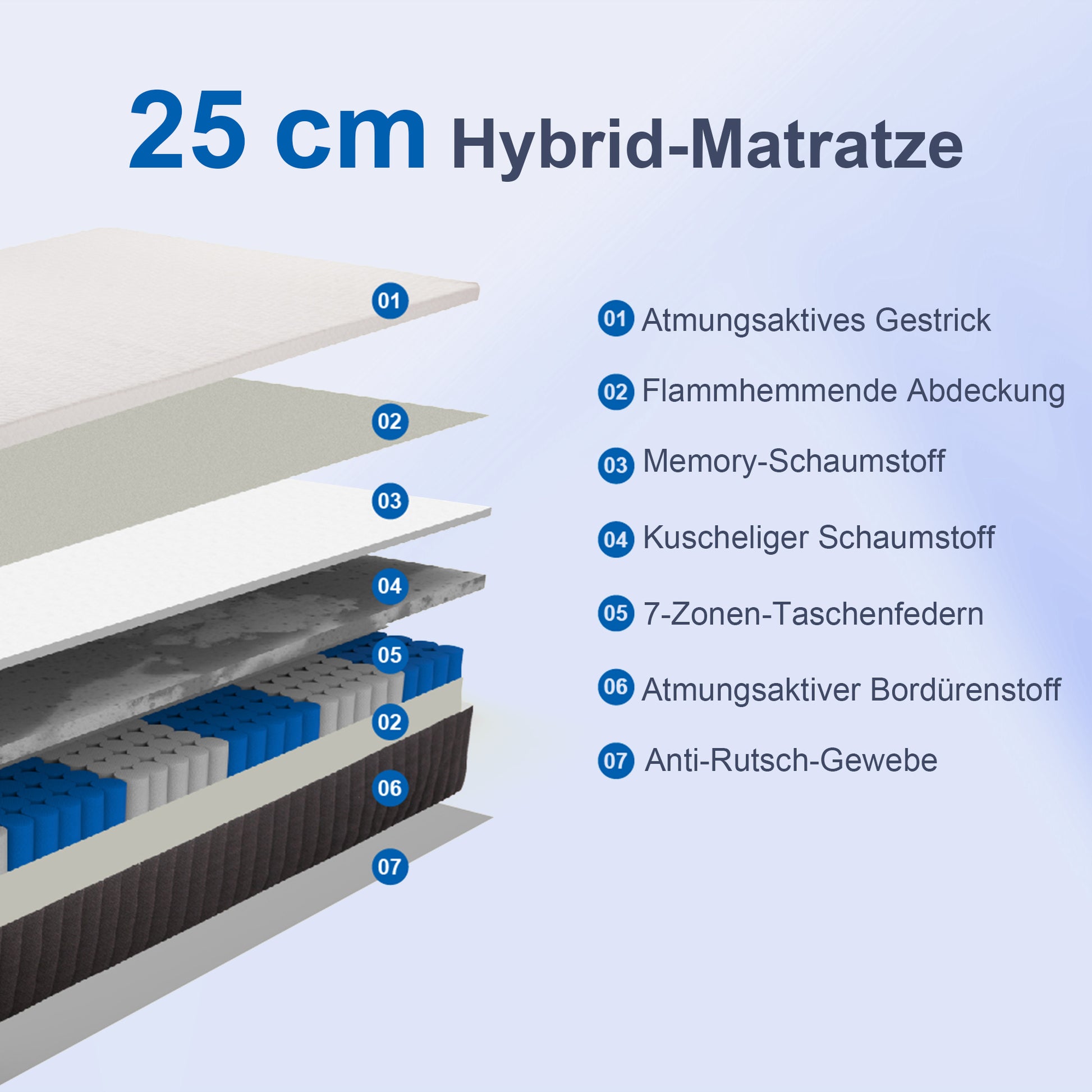 - ✔ Kombiniert Memory-Schaumstoff und einzeln verpackte Taschenfedern für stützenden und erholsamen Schlaf