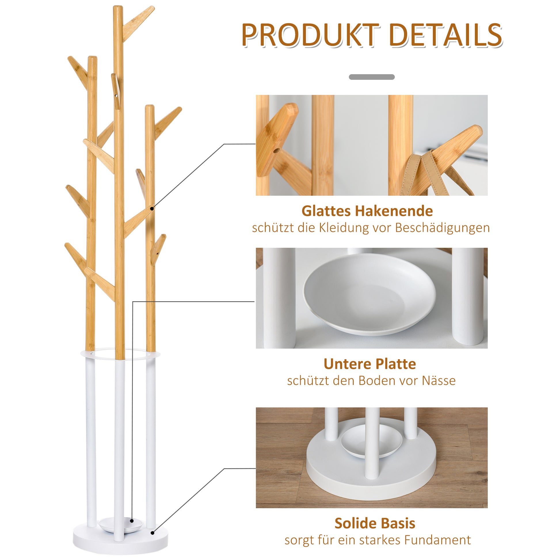 HOMCOM Garderobenständer, Kleiderständer mit 12 Haken und Schirmständer, Garderobe in Baumform, moderner Jackenständer für Kleidung, Hut, Tasche, für Wohnzimmer, Schlafzimmer, Bambus, Natur+Weiß
