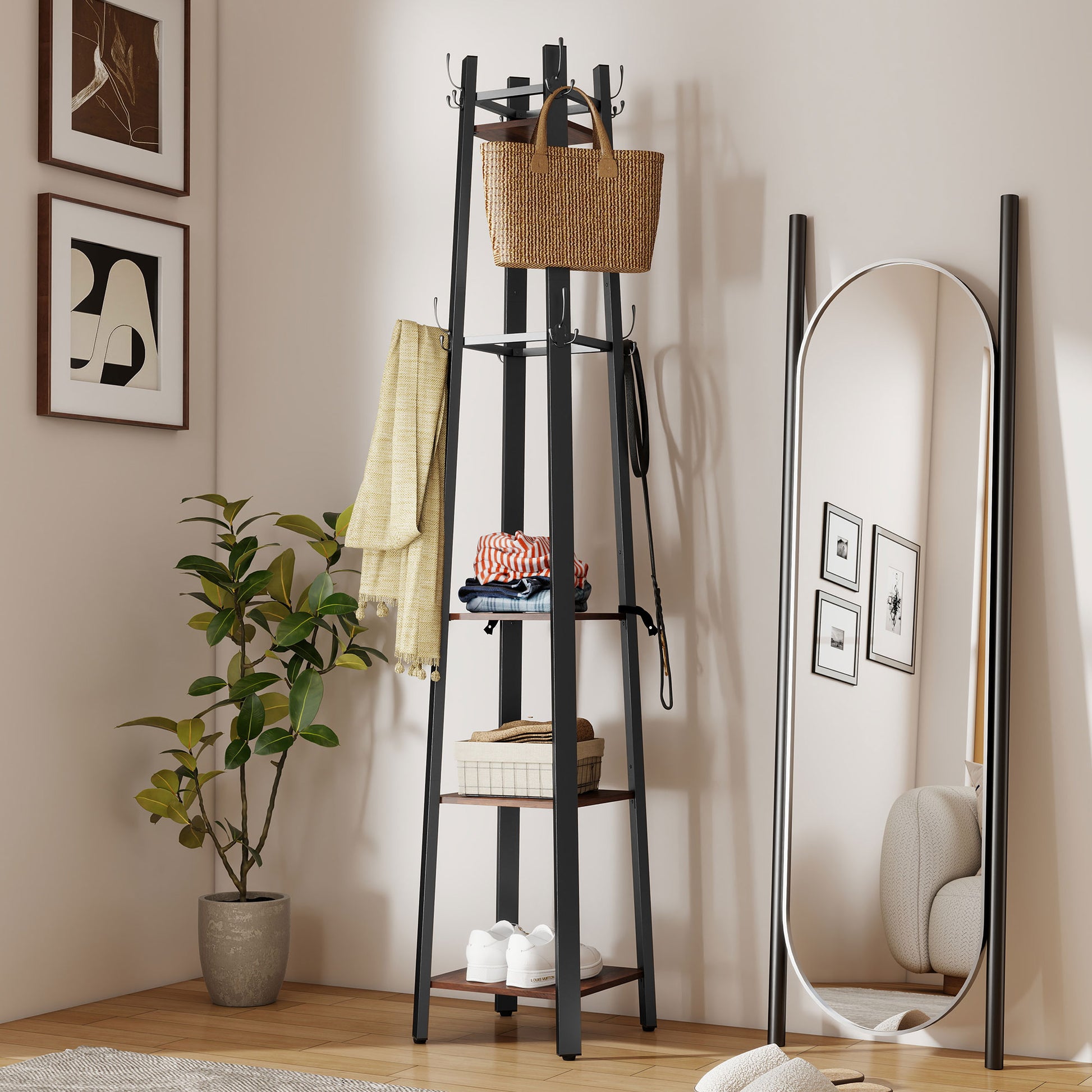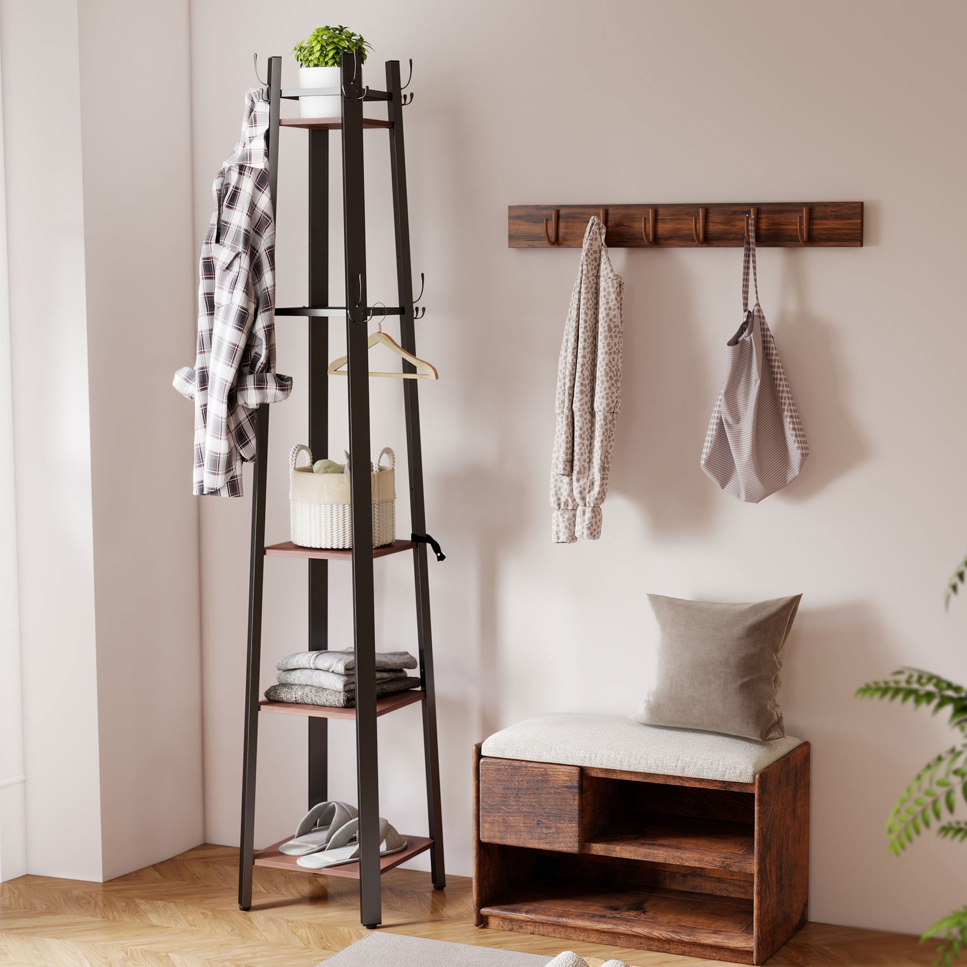 HOMCOM Garderobenständer mit 4 Ebenen, freistehender Kleiderständer, 8 Haken, 4 Regale, Industrie-Stil, Metall, Spanplatte, Braun