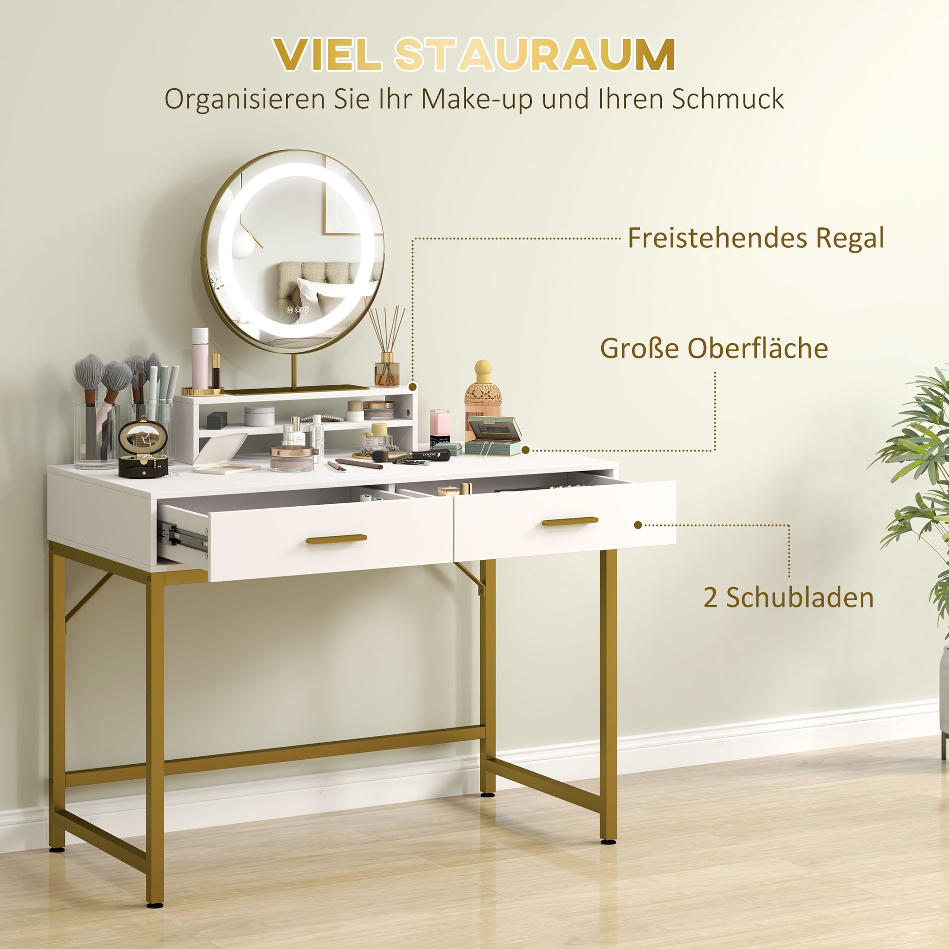 • ✔ Große Oberfläche, freistehendes Regal und zwei Schubladen zur Organisation von Kosmetika und Schmuck