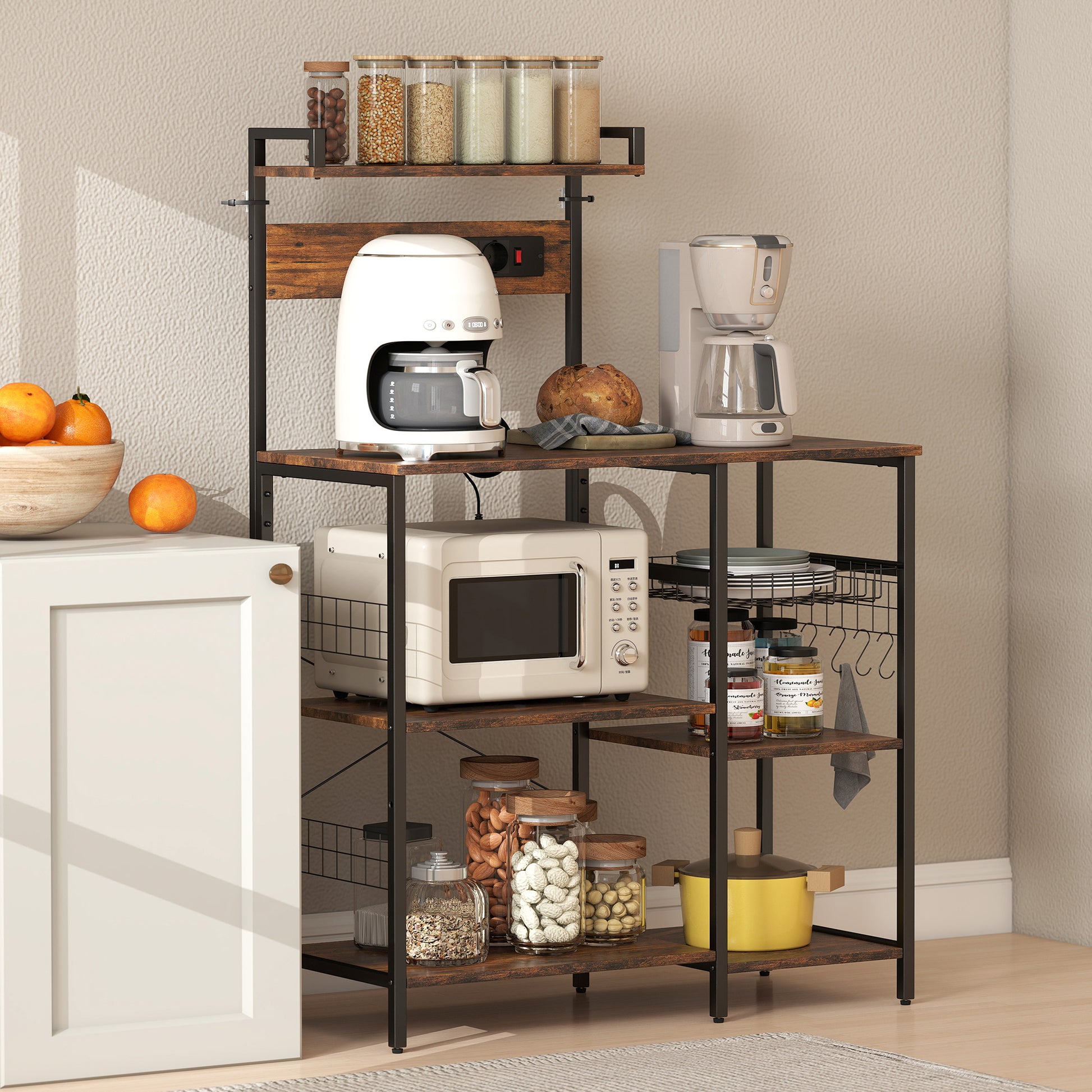HOMCOM Küchenregal, Standregal mit 2 Steckdosen, 5 S-Haken, 5 Ablagen, Korb, X-Streben Stahl 90 x 42 x 130 cm