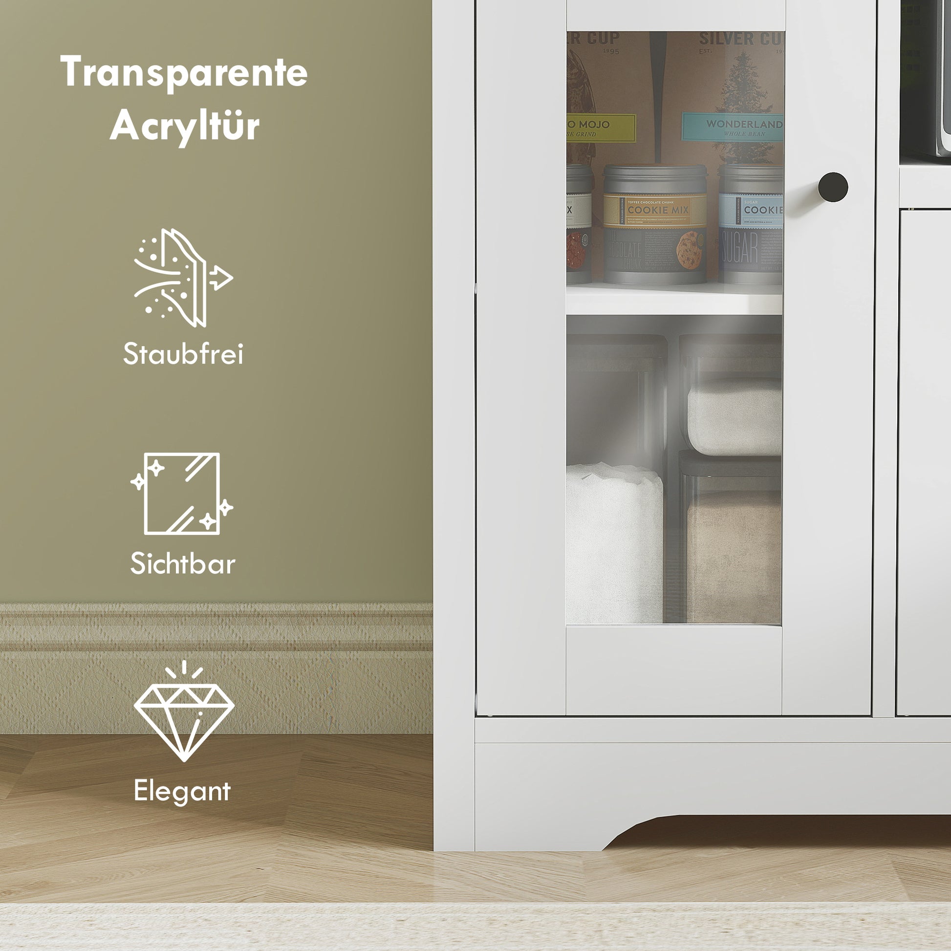 Dieser Küchenschrank verfügt über eine weite Ablage und ein offenes Fach mit Kabeldurchführung, ideal für Mikrowellen oder andere Geräte. Töpfe und Pfannen passen perfekt in die zwei Schränke des Sideboards und Besteck findet in der Schublade Platz. Der Schrank mit durchsichtiger Tür verfügt über ein verstellbares Regal, das die Aufbewahrung verschieden hoher Gegenstände ermöglicht und einen schnellen Überblick bietet, ohne dass die Tür geöffnet werden muss.