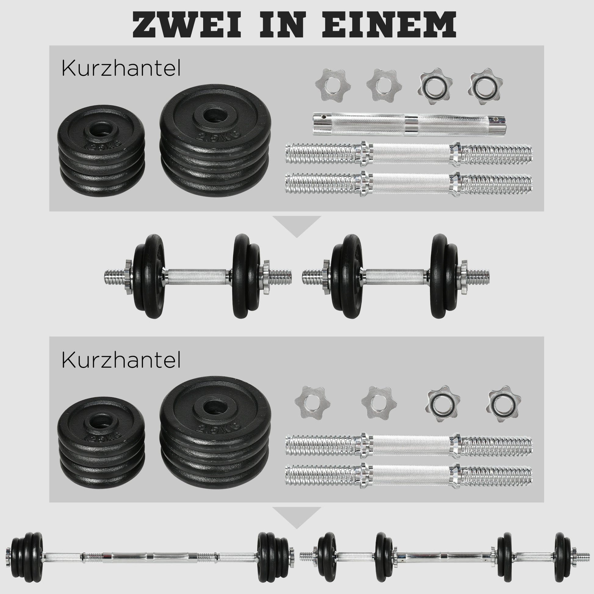 - ✔ Zwei Kurzhanteln kombinierbar zu einer Langhantel, insgesamt 20 kg Gewicht