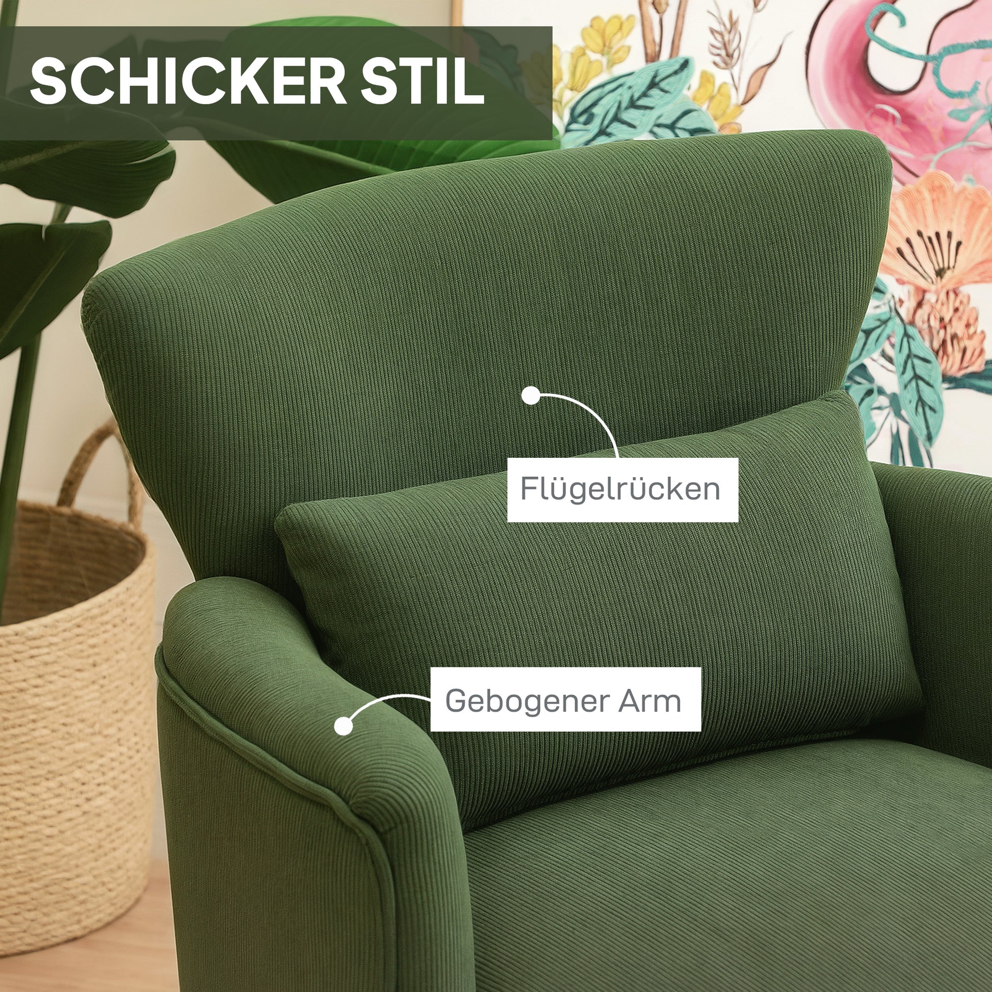 Lassen Sie sich in den bequemen HOMCOM Polsterstuhl fallen, die perfekte Ergänzung für Ihr Wohn- oder Schlafzimmer. Dieser kompakte gemütliche Sessel ist mit weichem, hochdichtem Schaumstoff und S-Federn in sanftem Cordstoff gepolstert, der sich Ihren Körperformen anschmiegt. Die hohe Rückenlehne und geschwungenen Armlehnen des Loungesessels sorgen für elegante Unterstützung, ideal für entspannte Stunden im Wohnzimmer oder in einer kuscheligen Leseecke.