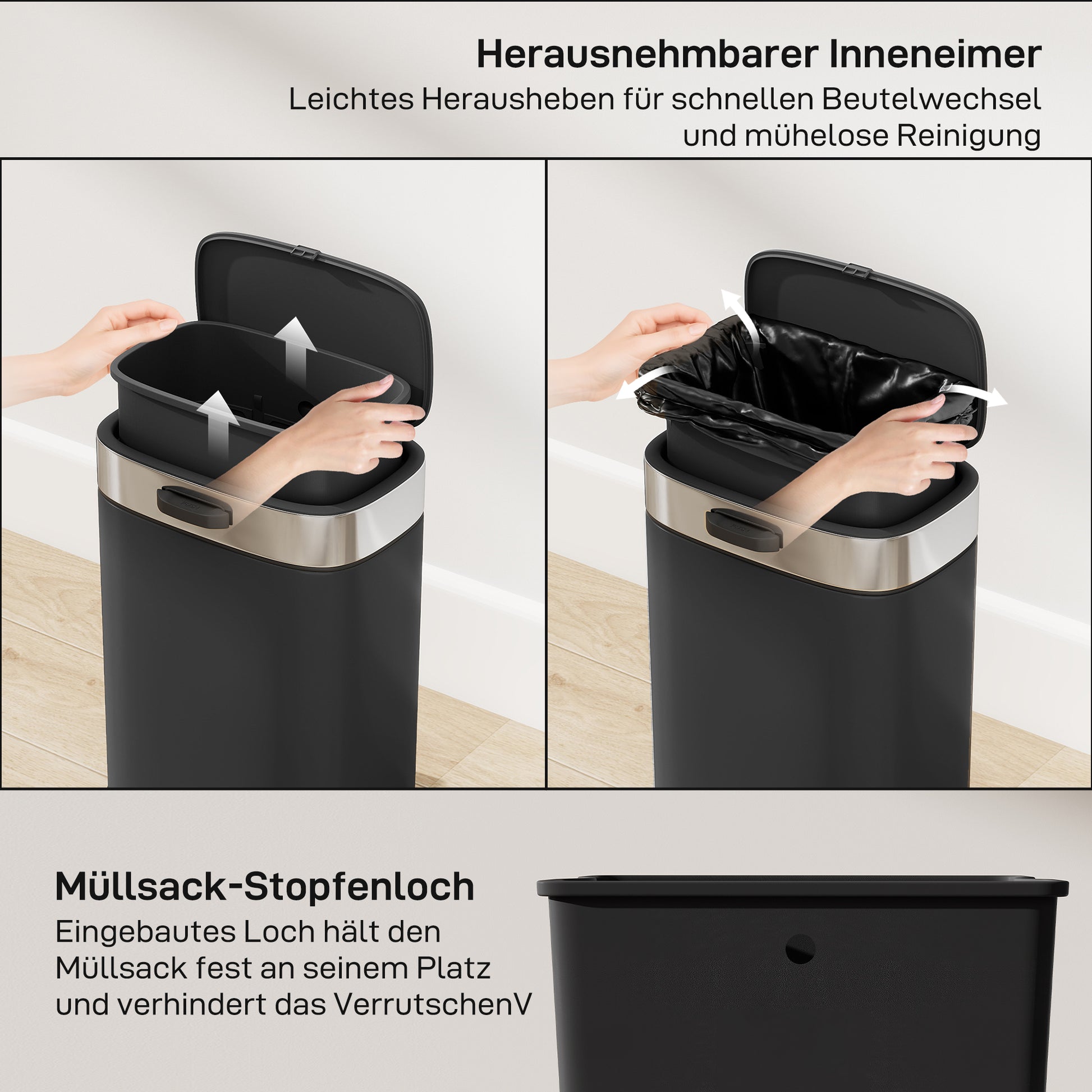 - ✔ Ein eingebauter Ring sichert den Müllbeutel und verhindert unordentliches Verrutschen und Rutschen.