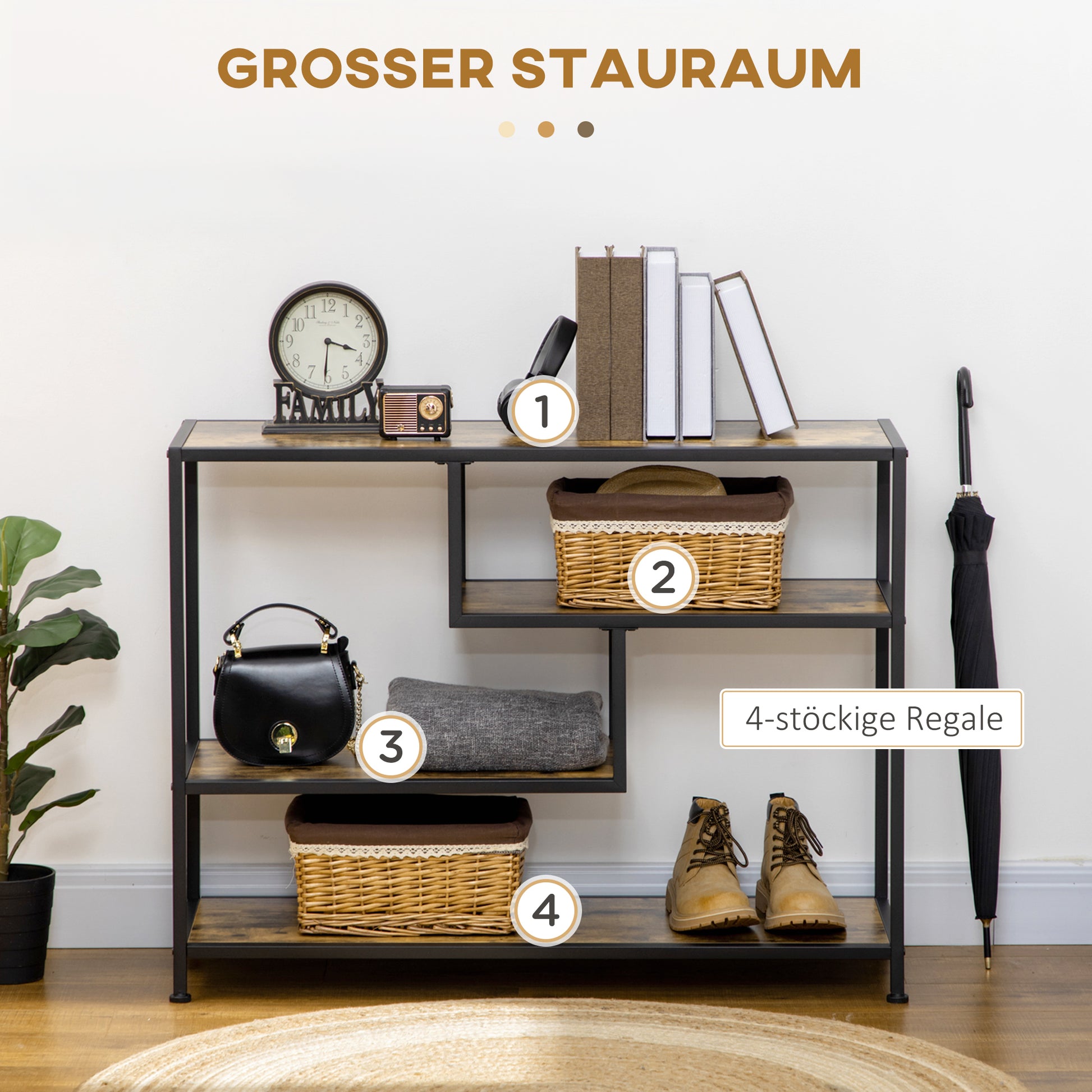 - ✔ Sie können Vasen und Fotos auf den 4 offenen Regalen platzieren