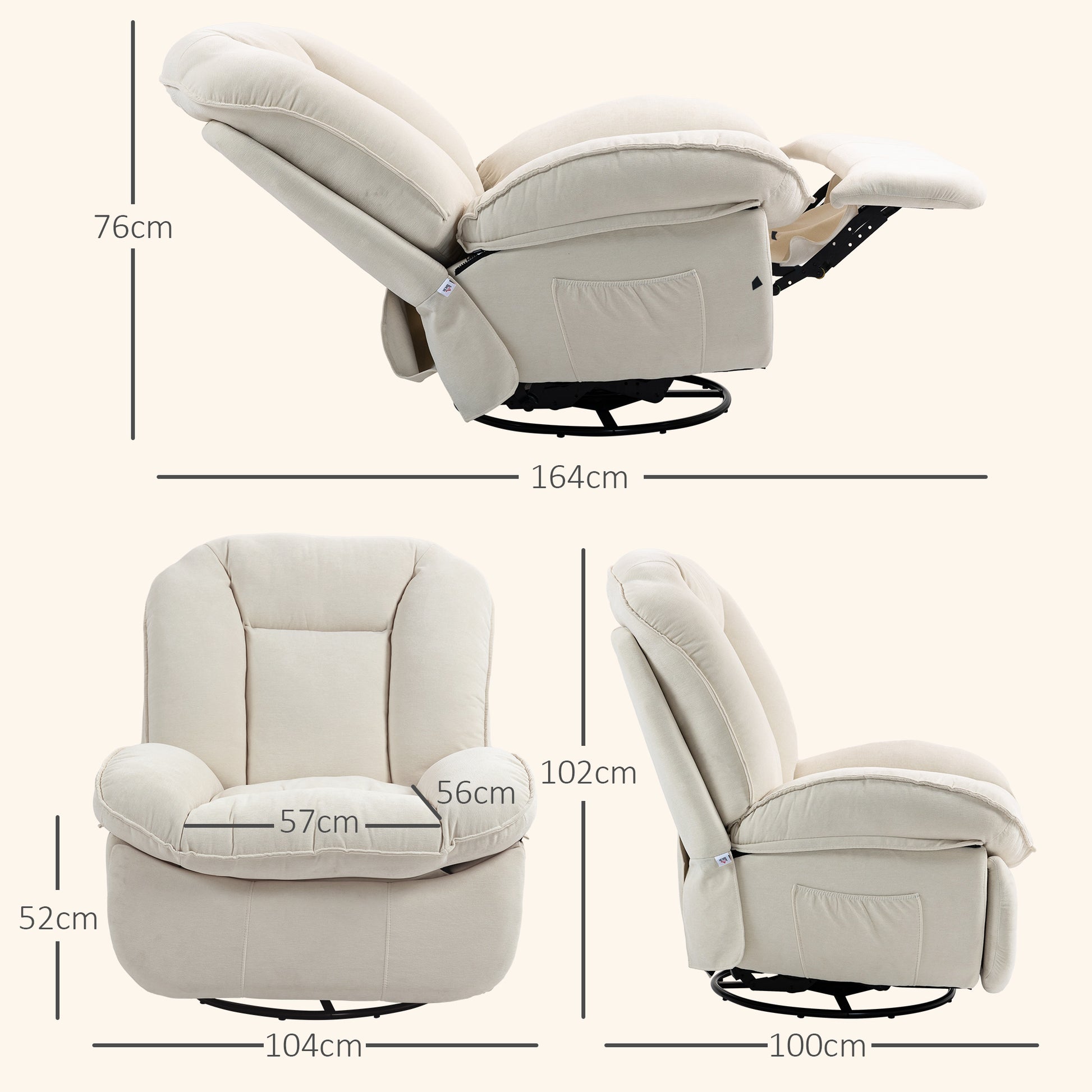 HOMCOM Relaxsessel, verstellbar, 104x100x102cm/164x76cm, Cremeweiß