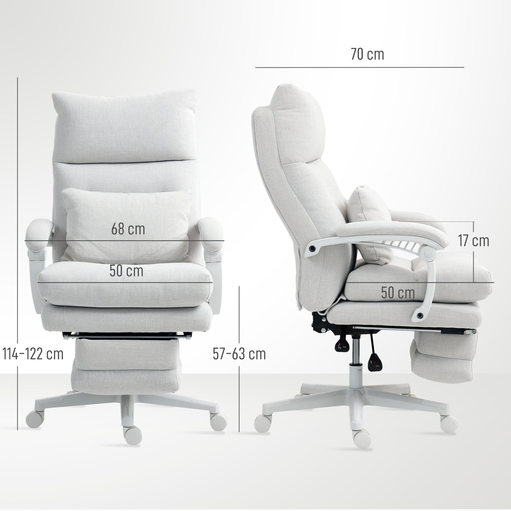 Genießen Sie den luxuriösen Komfort des HOMCOM Bürostuhls, eine perfekte Kombination aus Stil und Gemütlichkeit. Der Drehstuhl bietet eine 20 cm dicke, atmungsaktive Sitz- und Rückenlehne aus leinenartigem Stoff und ist mit weicher Kunststoff-Baumwolle gefüllt, was unübertroffenen Komfort garantiert. Mit einer Neigung von 160° und einer integrierten Fußstütze ist er ideal, um nach langen Tagen entspannt in Ihrem Wohnzimmer zurückzulehnen.
