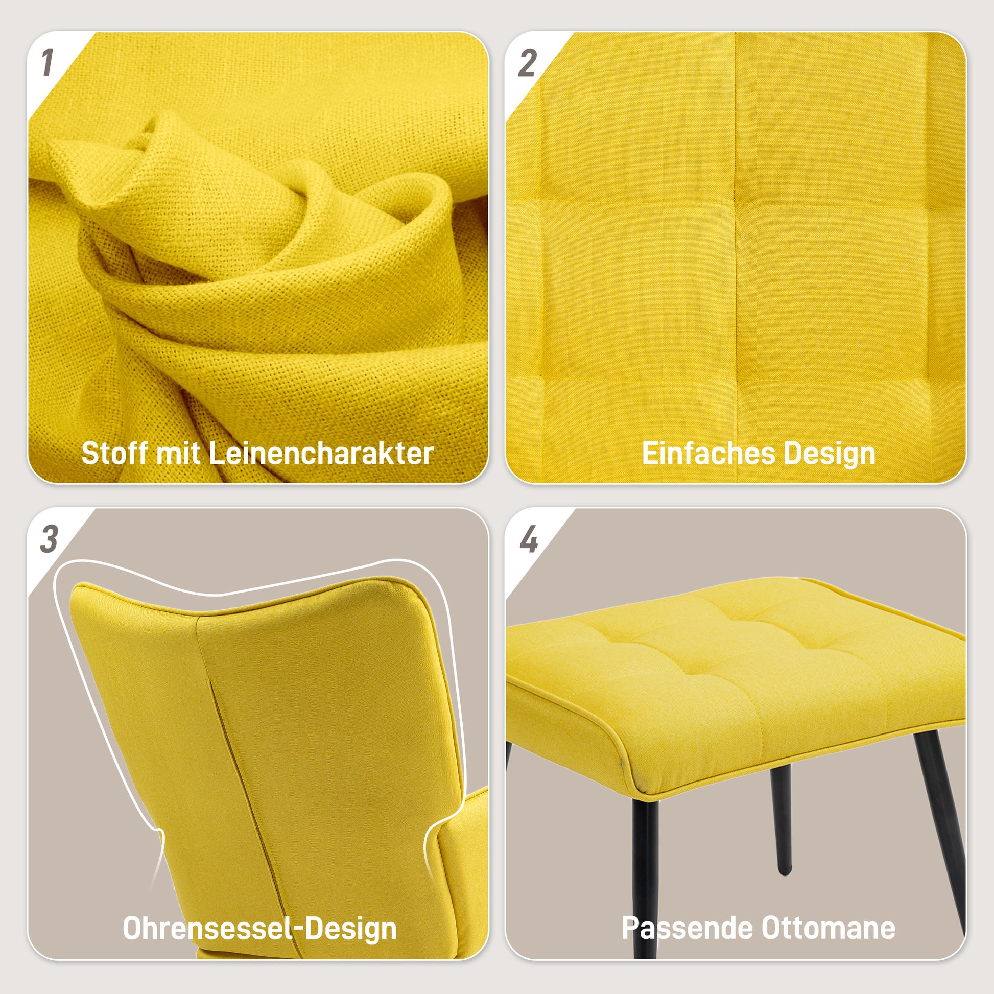HOMCOM Schaukelstuhl mit Ottomane Skandidesign Schaukelstuhl mit Fußhocker, Buchenholz, Steppung, 64 cm x 89 cm x 90 cm Gelb