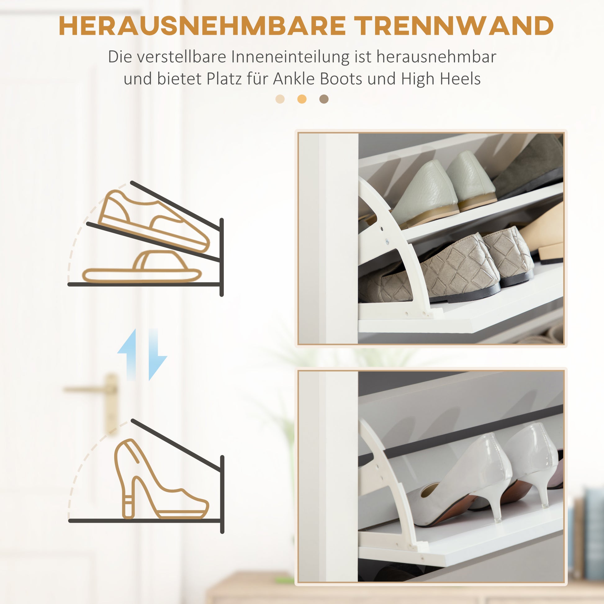 Unser Schuhschrank von HOMCOM ist mit seinen drei großen Klappen der ideale Aufbewahrungsort für Ihre Schuhe. Er zeichnet sich besonders durch sein großes Fassungsvermögen aus und bietet je nach Form und Größe der Schuhe Platz für 10 bis 18 Paar. Die Trennwände, die jede Klappe nochmals in zwei Fächer teilen, lassen sich in zwei Positionen verstellen, so dass Ihre Schuhe ausreichend Platz finden. Der weiße Schuhkipper ist dank seiner wasserabweisenden Oberfläche sehr pflegeleicht und langlebig.