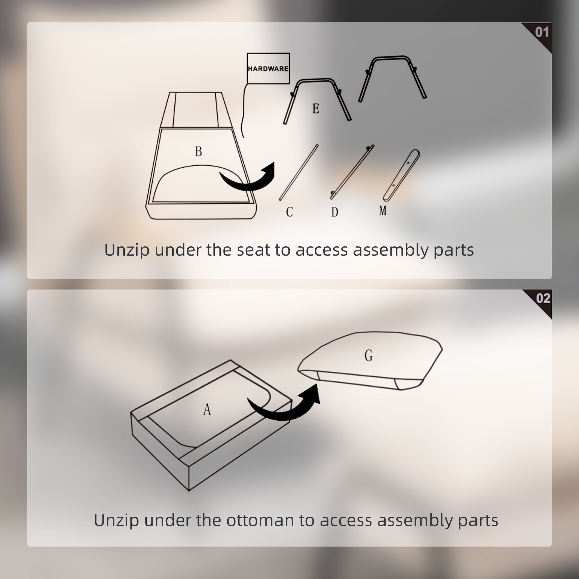 - ✔ Hinweis: Das Montagezubehör befindet sich unter dem Sitz und der Ottomane. Öffnen Sie einfach die Reißverschlüsse der Abdeckungen, um darauf zuzugreifen