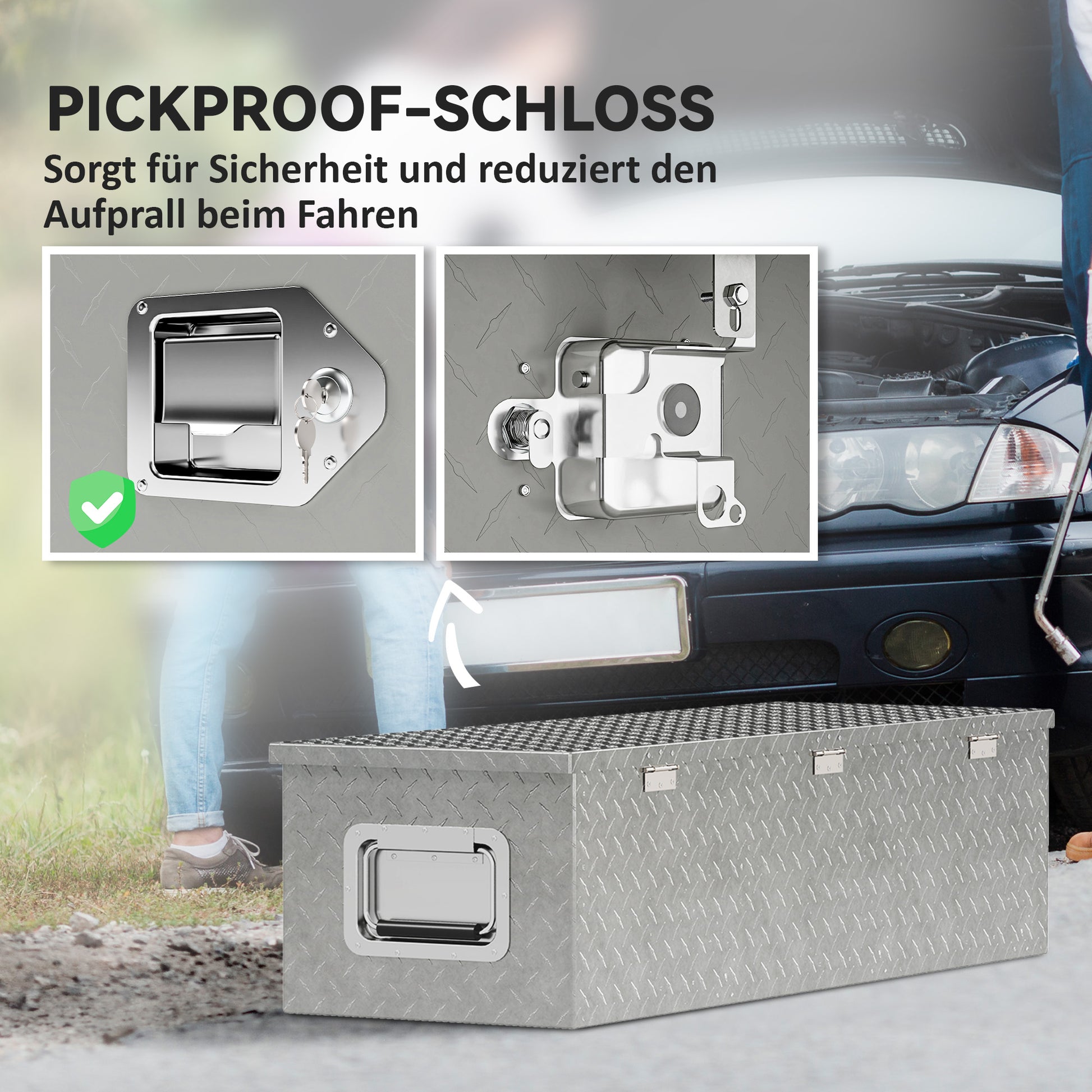 Suchen Sie eine praktische Aufbewahrungslösung für unterwegs? Die robuste HOMCOM Transportkiste bietet dank Aluminium-Konstruktion und Wetterbeständigkeit optimalen Schutz für Ihre Gegenstände. Mit abschließbarem, großzügigem Design passt sie zu vielen Anhängertypen und ist unverzichtbar, um Ihre Ausrüstung sicher und organisiert zu verstauen.