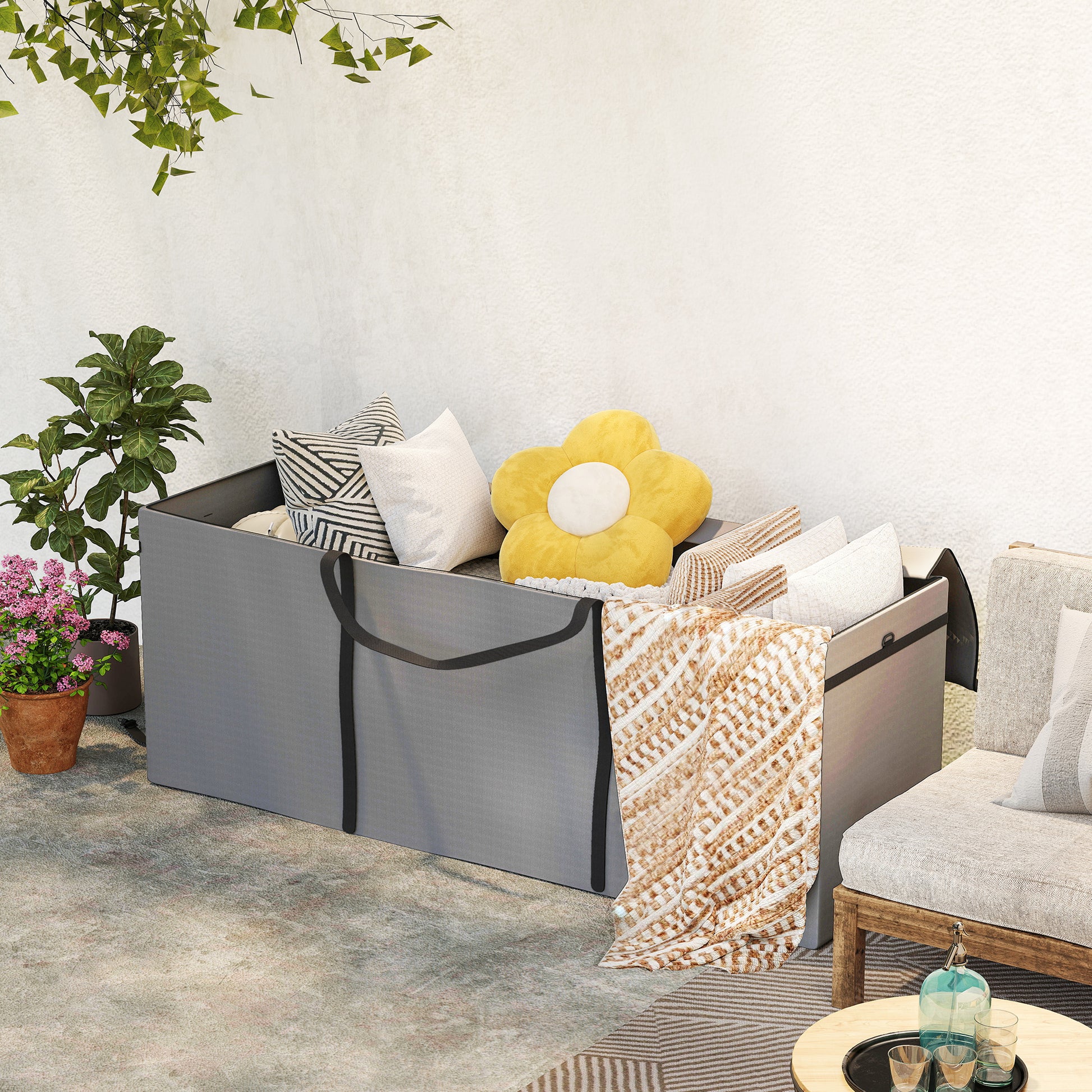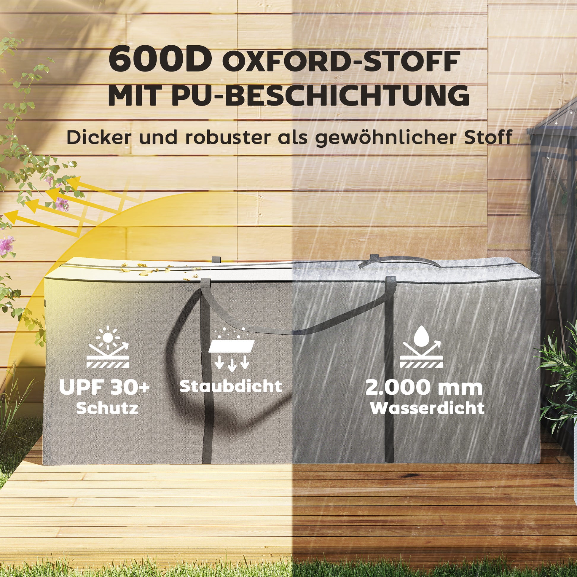 Stilisieren Sie Ihren Garten mit der wasserdichten Outsunny Gartenkissen-Aufbewahrungstasche aus widerstandsfähigem Material. Diese 900 L große Auflagentasche schützt Ihre Kissen optimal vor Wasser, UV-Strahlen und Staub dank einer Wasserdichtigkeit von 2.000 mm und UPF 30+. Der bequeme Zwei-Wege-Reißverschluss der Polstertasche erleichtert den Zugriff, sodass alles trocken und schnell verfügbar bleibt.
