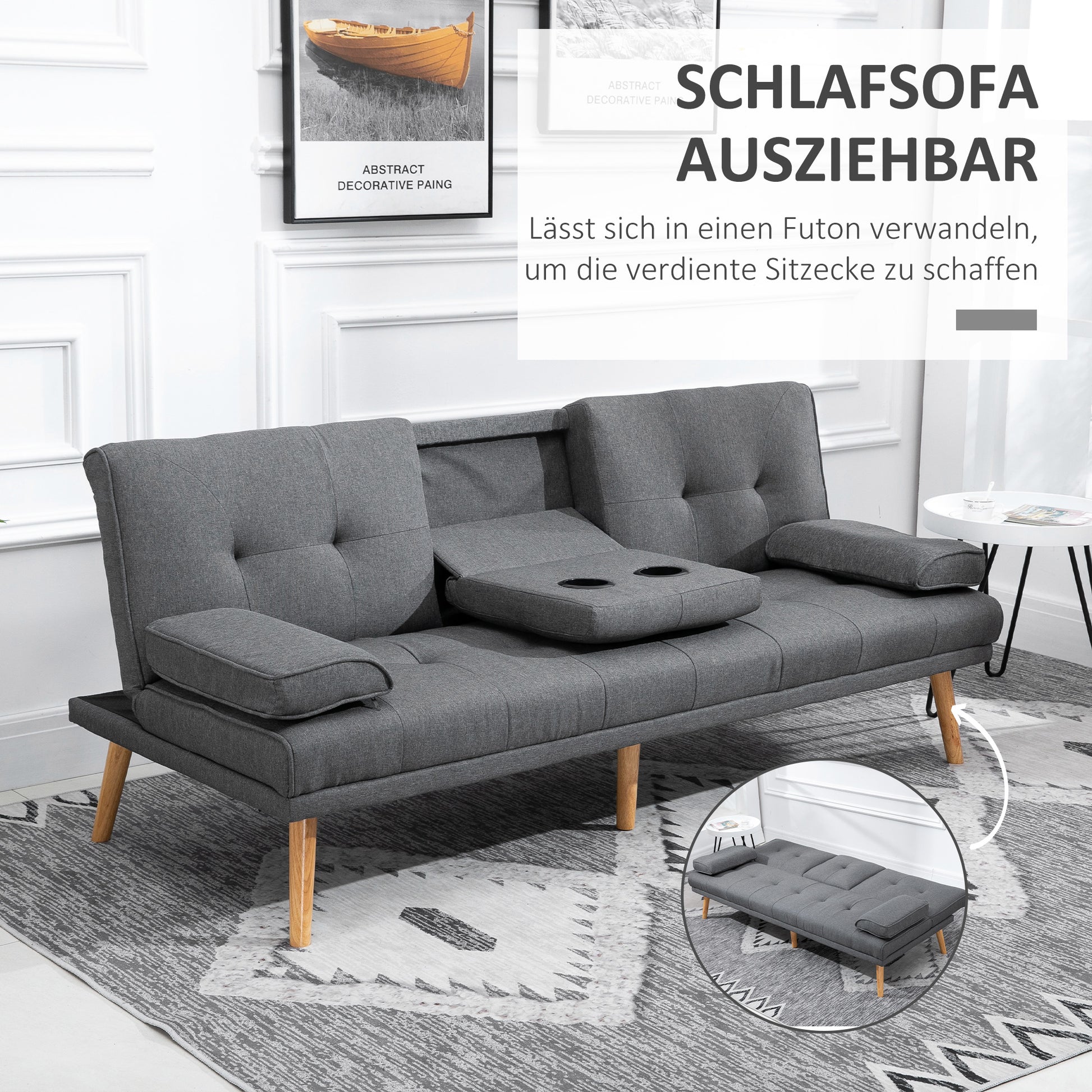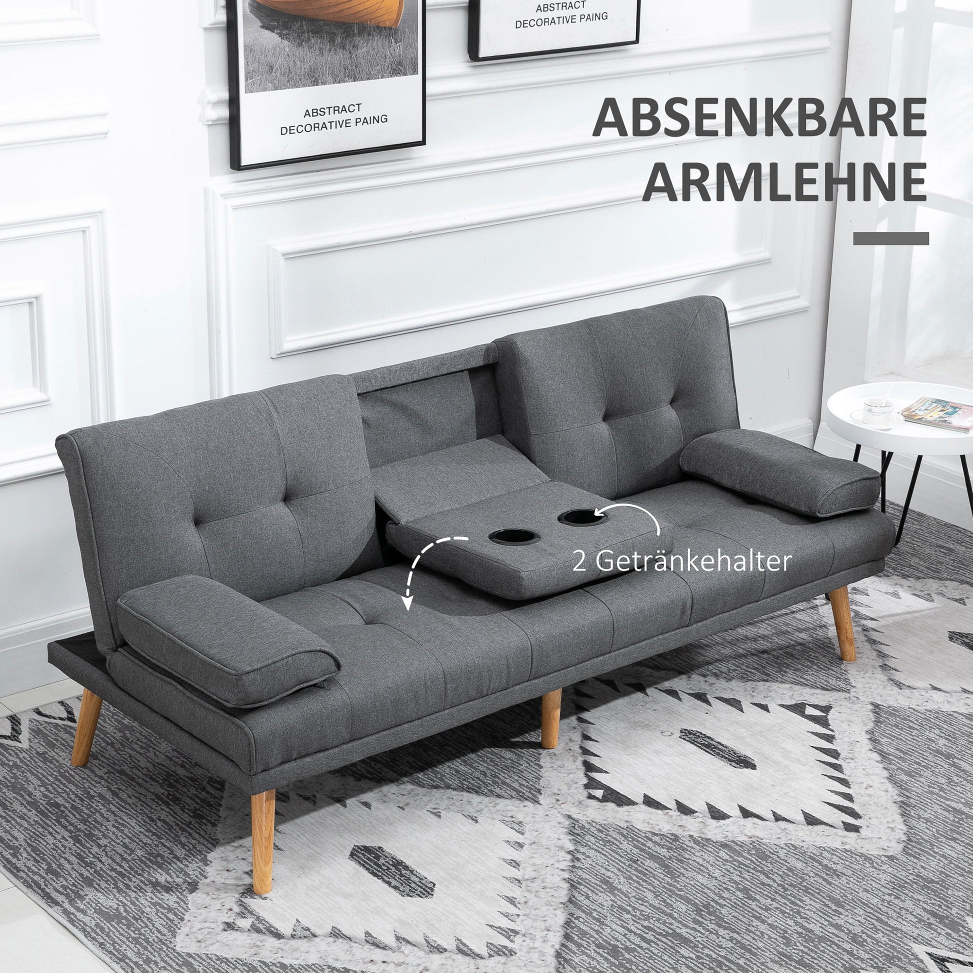 Ob für gesellige Abende mit Freunden oder entspannte Nächte, dieses elegante Schalfsofa von HOMCOM bietet Platz für bis zu drei Personen. Die dreifach verstellbare Rückenlehne ermöglicht Ihnen, mühelos zwischen Sitzen, Zurücklehnen und Schlafen zu wechseln. Der robuste Rahmen und die Massivholzfüße garantieren Stabilität, während die dick gepolsterte Sitzfläche höchsten Komfort bietet. Zudem verwandelt sich der Mittelteil der Rückenlehne in einen praktischen Beistelltisch mit Getränkehaltern.