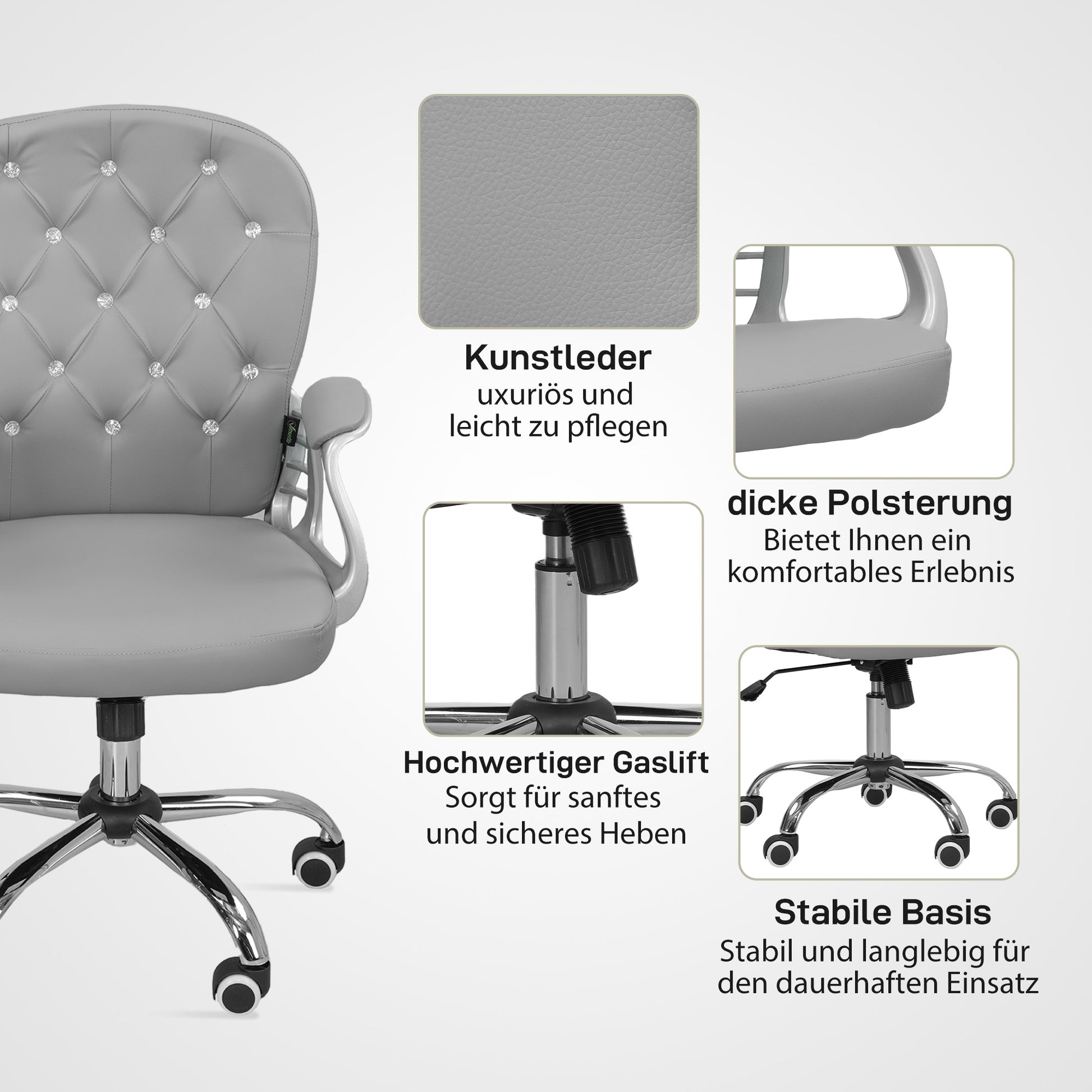 - ✔ Ausgestattet mit einer dekorativen Rückseite, fügt sich dieser elegante Bürostuhl nahtlos in jedes Ambiente ein – ob Schlafzimmer, Wohnzimmer, Esszimmer oder Büro