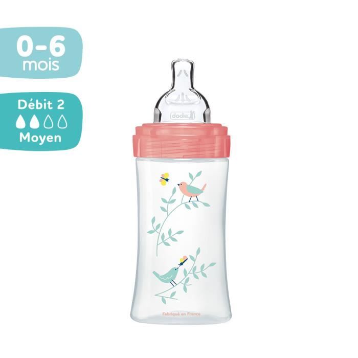 Sensation + 270mL bottle, Garden decorations, equipped with a flat medium flow teat for babies from birth. Its anti-colic system is integrated into the pacifier thanks to a patented double valve, which promotes air circulation and reduces the risk of colic, aerophagia and regurgitation. The flat nipple mimics the flattened shape of the breast during feeding.