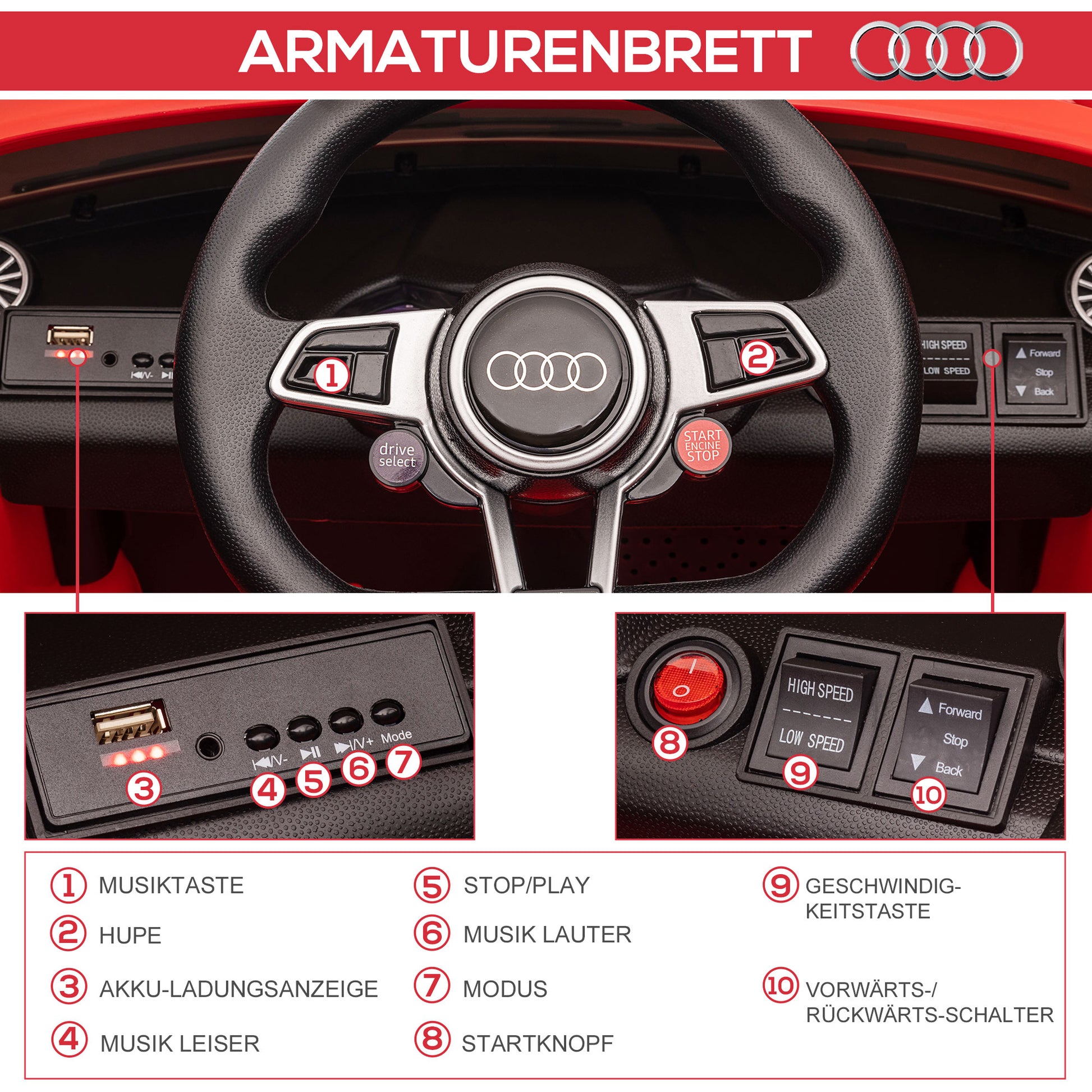 HOMCOM Audi Kinder Elektroauto 12V mit 2,4G Fernbedienung, Musik, Hupe, Elektrofahrzeug mit LED-Leuchte, USB/MP3-Anschluss, Rückwärtsfunktion, für Kinder 3-5 Jahre, Rot