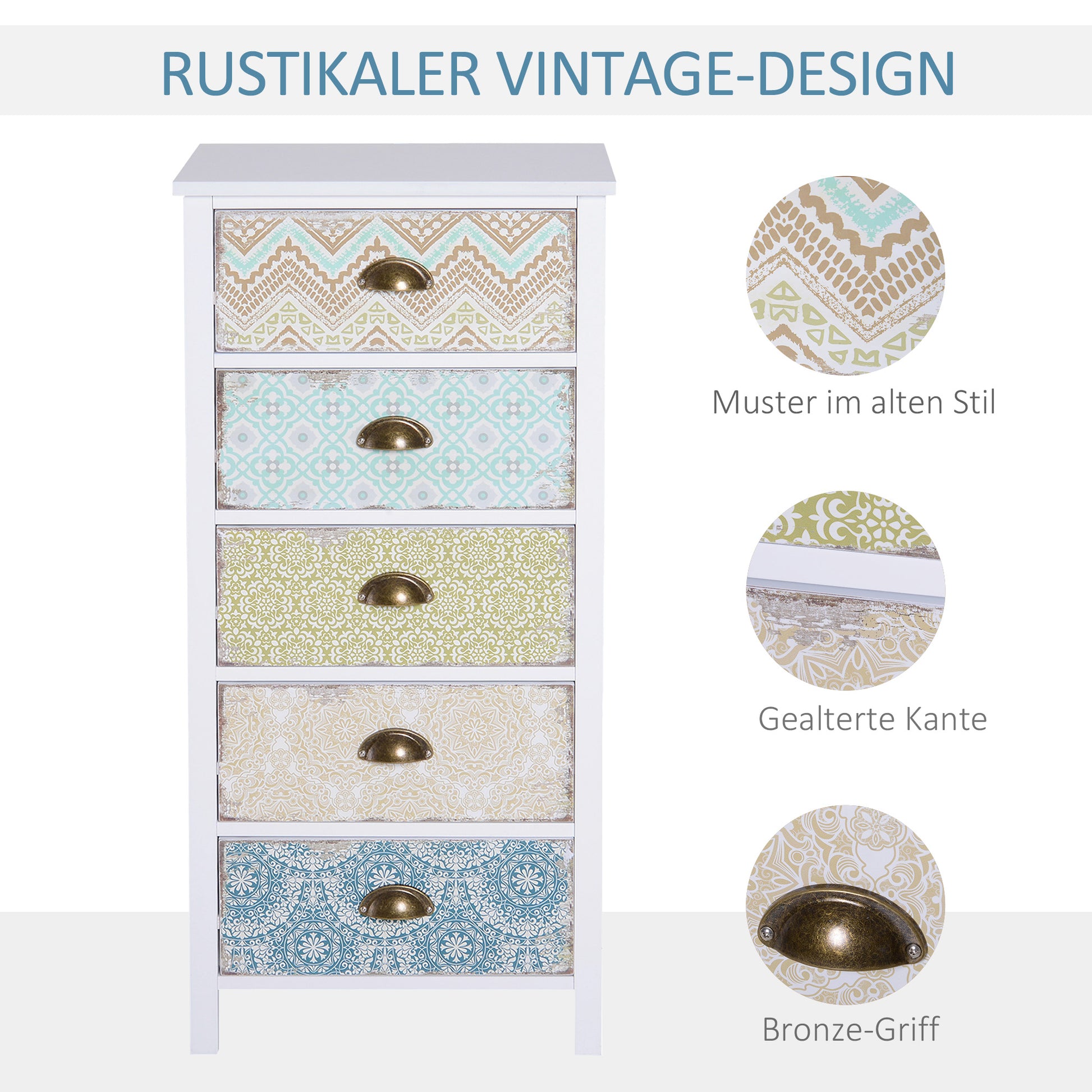Bereichern Sie Ihr Zuhause. Unserer Kommodenschrank von HOMCOM hat einen charmanten Shabby-Chic-Look. Helle Farben und ein Hauch von Vintage runden Ihr Zuhause ab. In den fünf leichtgängigen Schubladen haben Sie Platz für alles, was Ihnen wichtig ist. Die Griffe sorgen für einen nostalgischen Touch. Der Aufbau ist kinderleicht. Sie können Ihre charaktervolle Kommode aufstellen, wo immer Sie möchten.