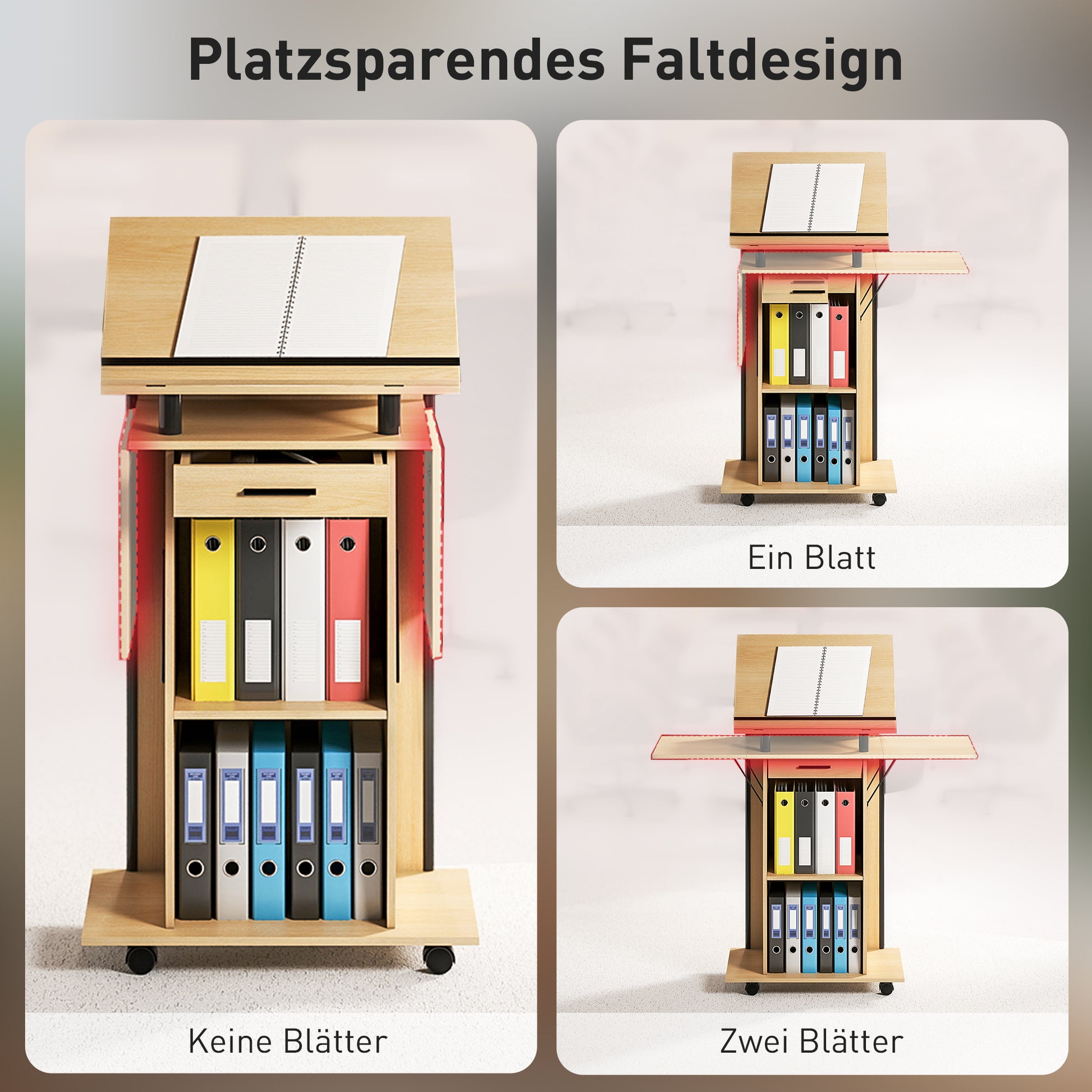 Gestalten Sie Ihren Arbeitstag effizienter mit dem HOMCOM Rednerpult. Ideal zum Lesen, Zeichnen oder Präsentieren geeignet, hält die 7-fach verstellbare Oberfläche Ihren Laptop optimal an Ort und Stelle. Erweitern Sie bei Bedarf die Seitenflächen für mehr Platz und falten Sie sie nach Gebrauch einfach zusammen. Integrierte Aufbewahrungsmöglichkeiten des Stehpults für Notizen, Stifte und Werkzeug halten alles Wichtige griffbereit.
