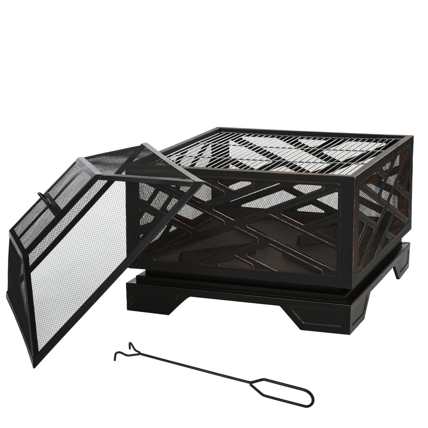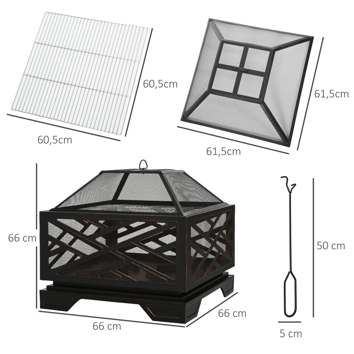 Outsunny Feuerschale mit Funkenschutz, Grillrost, Schürhaken, quadratisch, Stahlgehäuse, schwarz, 66 x 66 cm