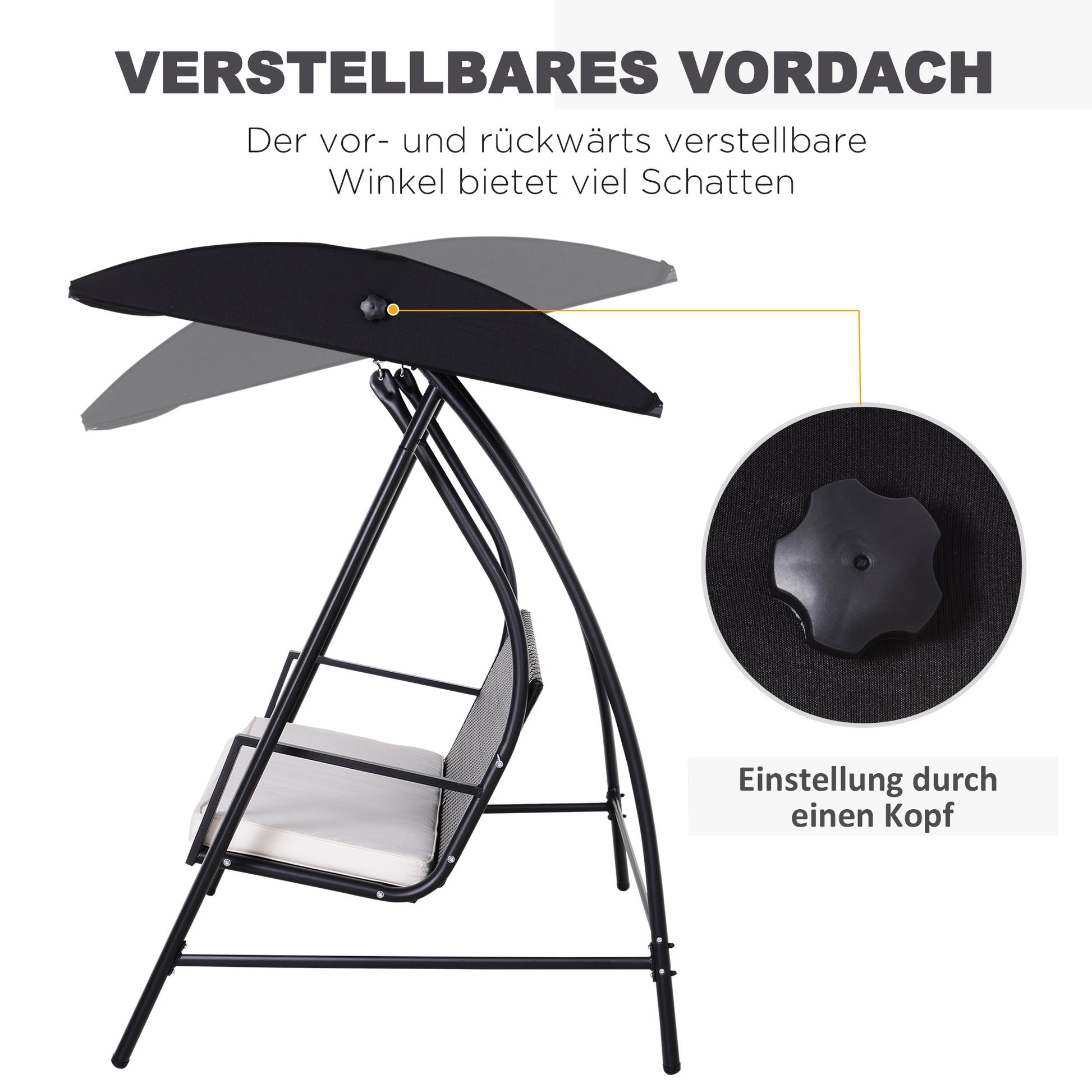 Bereichern Sie Ihren Garten mit diesem bequemen, modernen Schaukelstuhl von Outsunny! Das robuste Material und das hochstabile Metallgestell machen diese Schaukel wetterfest, äußerst belastbar und für den dauerhaften Einsatz im Freien geeignet. Das praktische Sonnensegel bietet Sicherheit an hellen Sommertagen und ermöglicht es Ihnen, mit bis zu zwei Personen im angenehmen Schatten zu entspannen. So kann der Sommer kommen!