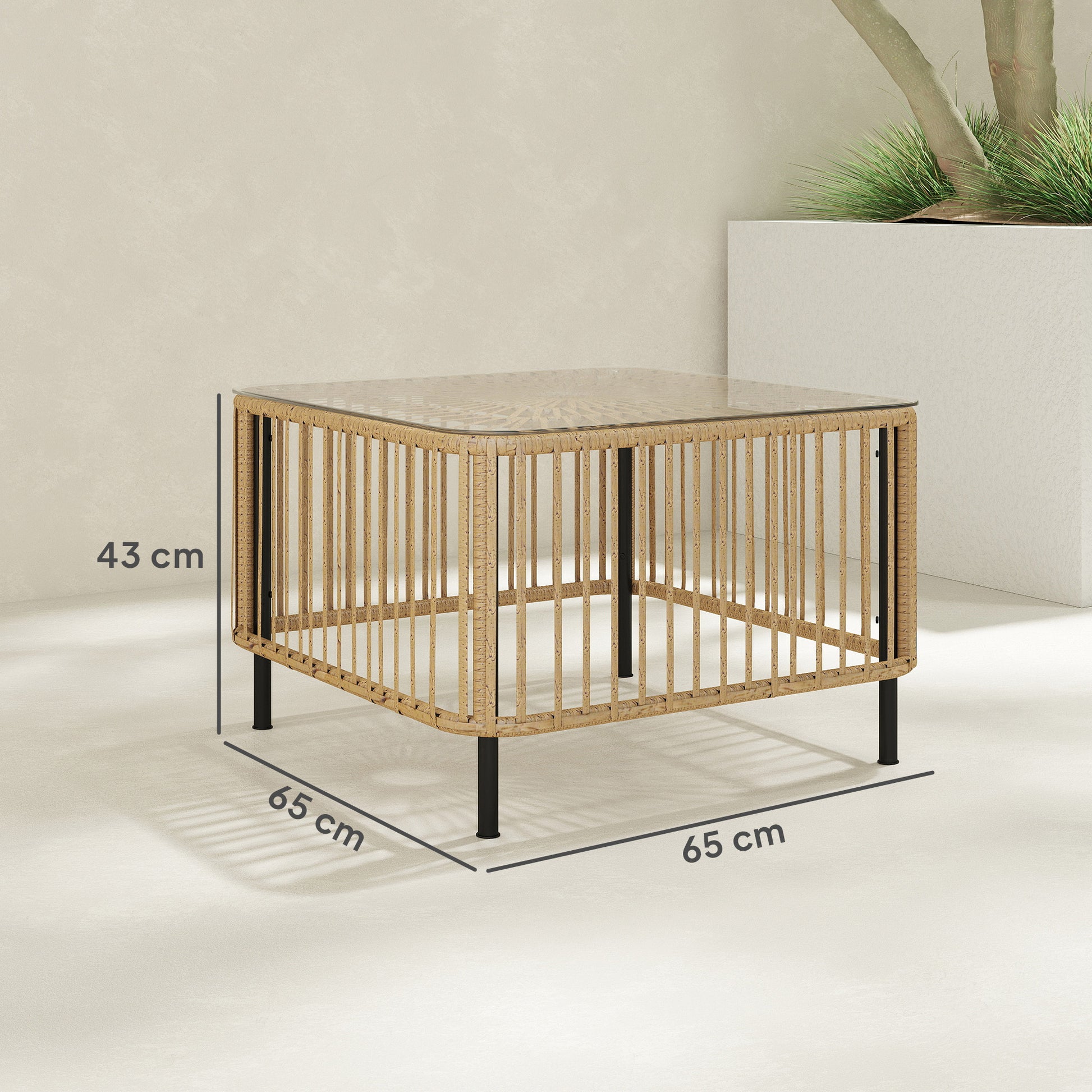 Outsunny Polyrattan Gartentisch, 65 x 65 x 43 cm, wetterfest Beistelltisch quadrarisch mit Glasplatte Naturholz