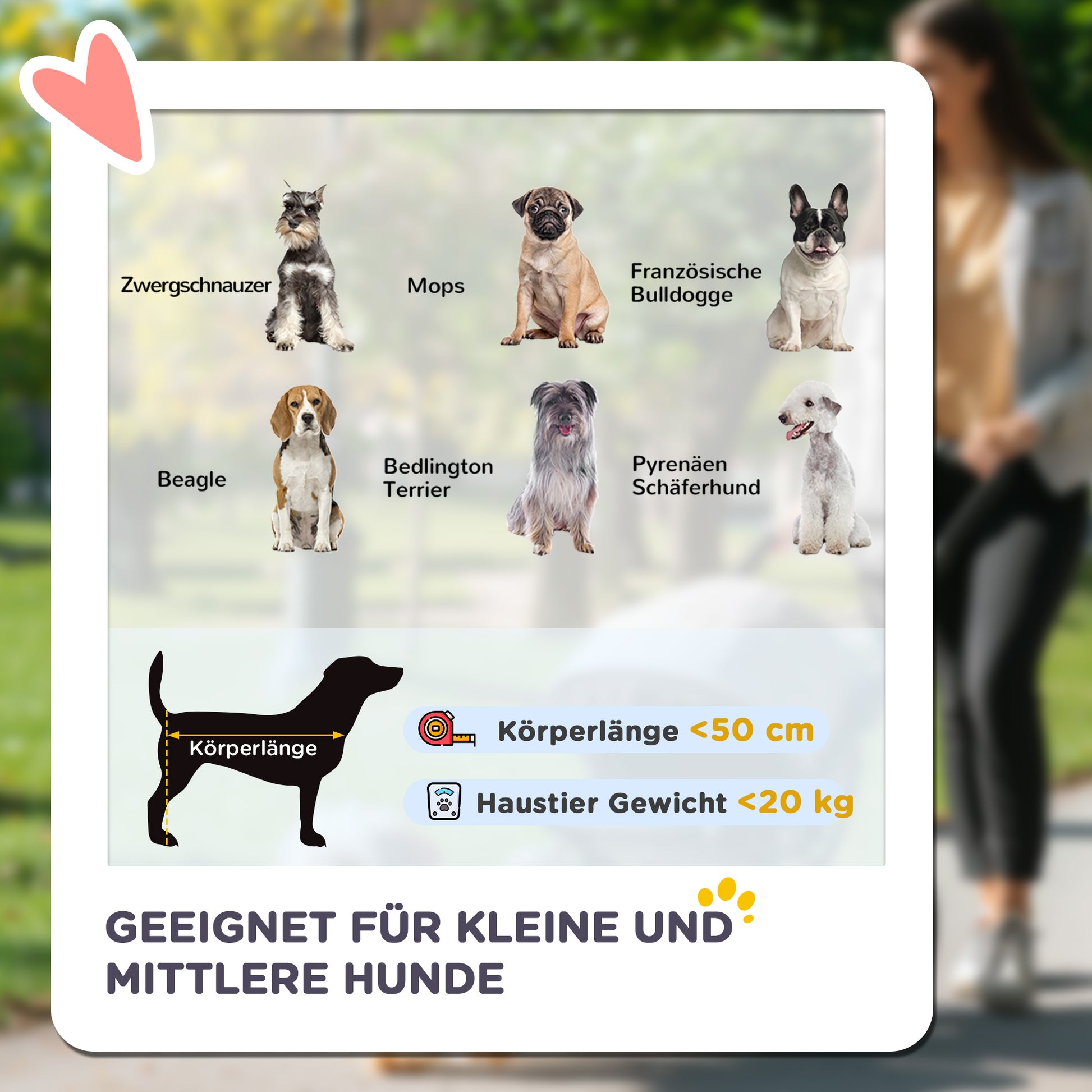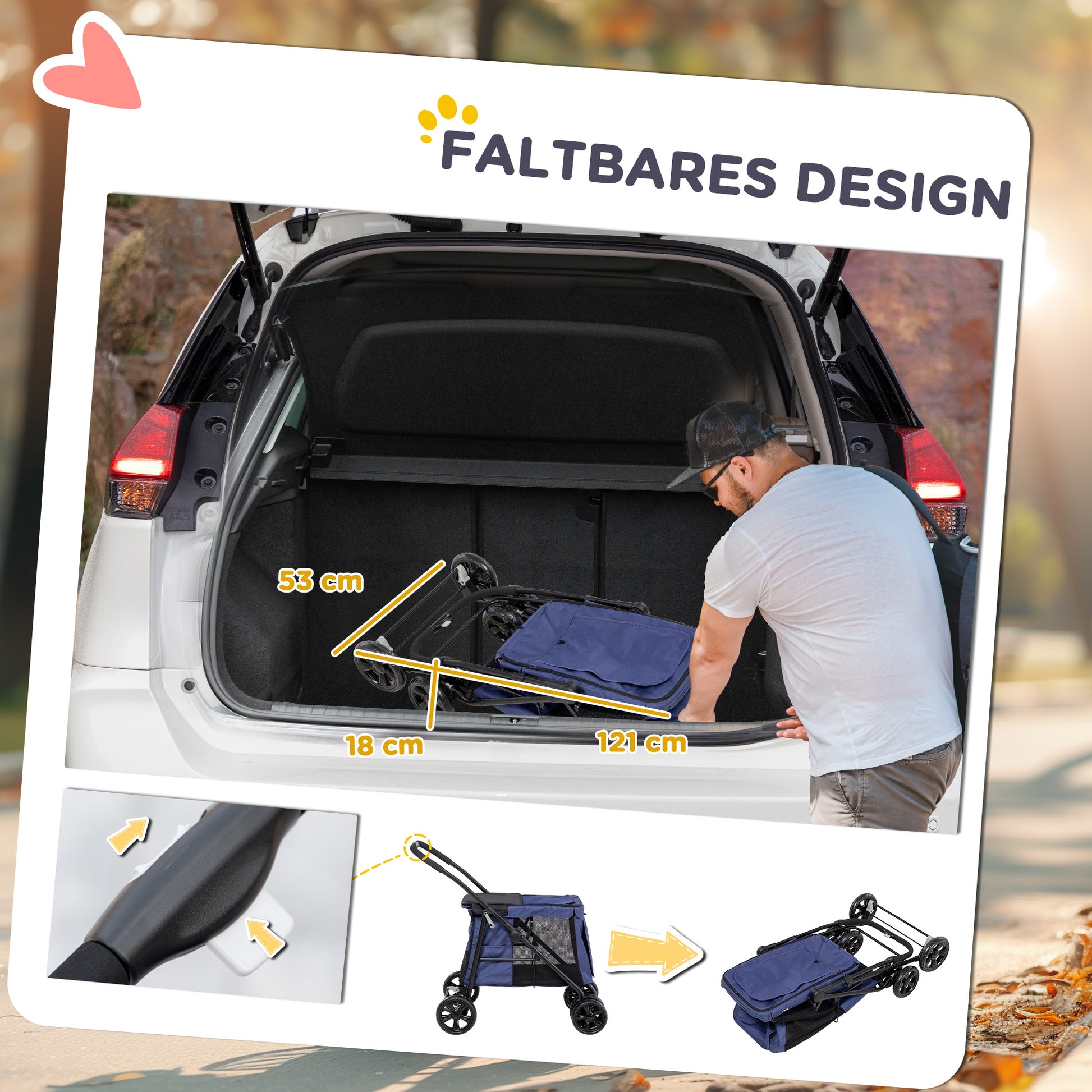 Mit dem PawHut Hundewagen können Sie Ihr Haustier sicher mit nach draußen nehmen. Er lässt sich mit einem Klick zusammenklappen und ist leicht zu transportieren. Vier Räder und ein Griff erleichtern das Fortbewegen auf der Straße. Der Hundetrolley ist geräumig, sodass Ihr pelziger Freund viel Platz im Inneren hat, Mesh-Fenster und -Türen lassen ausreichend Luft hinein und hinaus. Die Stoffabdeckung kann zur besseren Belüftung aufgerollt werden.