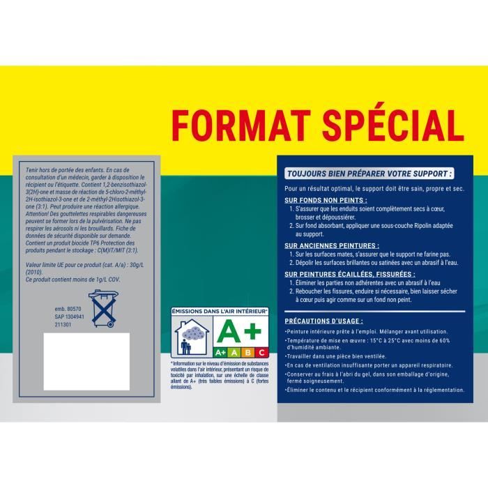 Formula specially designed for large ceilings! (greater than 4 m wide). Thanks to a slower drying, this special large-surface ceiling paint ensures you an impeccable result, without any trace of recovery. - Great ease of application - NF Environment - Formula A +