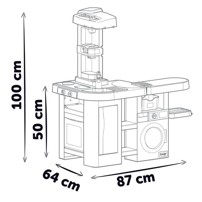 The Clean Tefal kitchen is the ultimate imitation game! This kitchen, including a cleaning area, will undoubtedly appeal to your children, who will be able to play alone or with friends. Several areas have been designed to make the game last: sink with tap , oven, fridge, hood, coffee machine, soda machine,