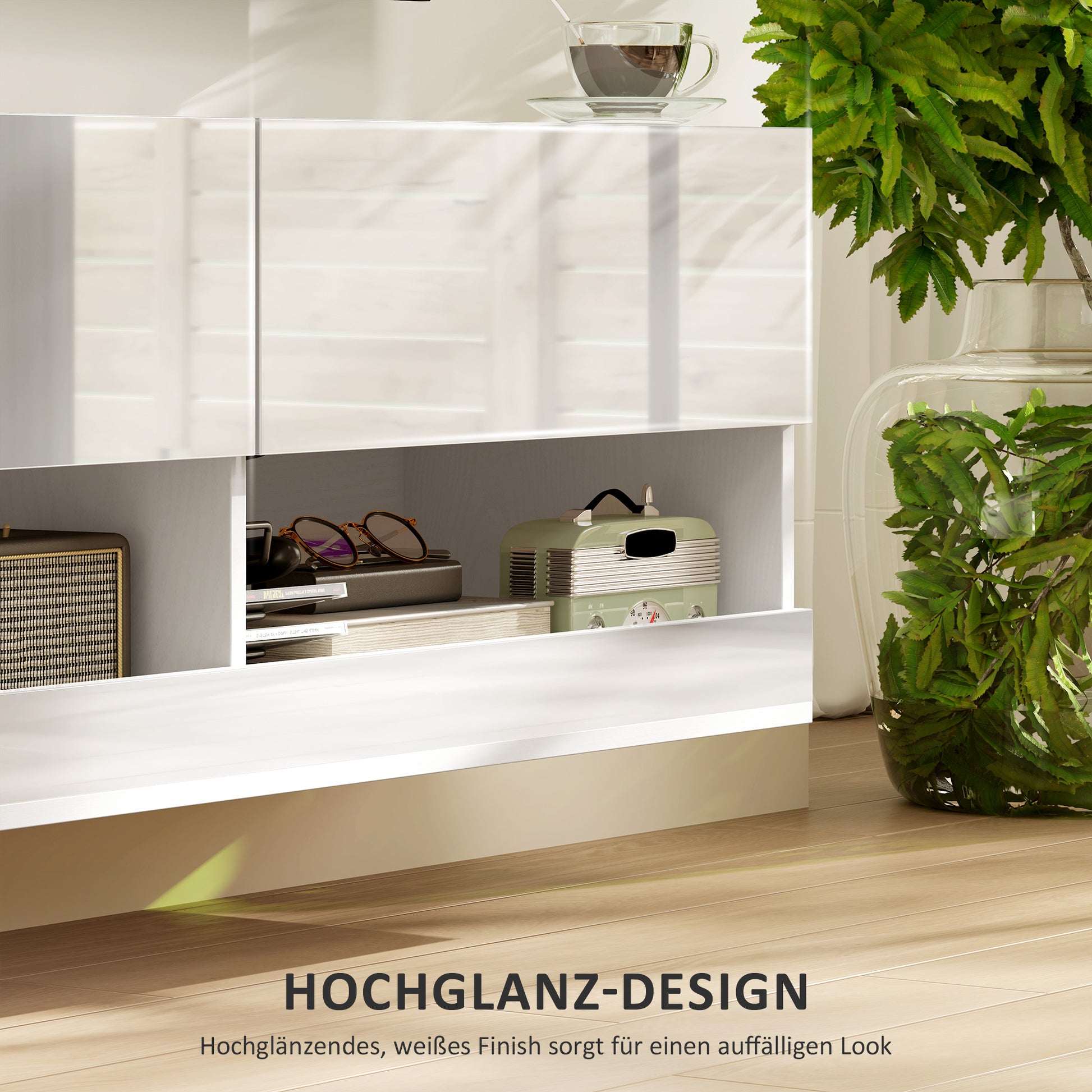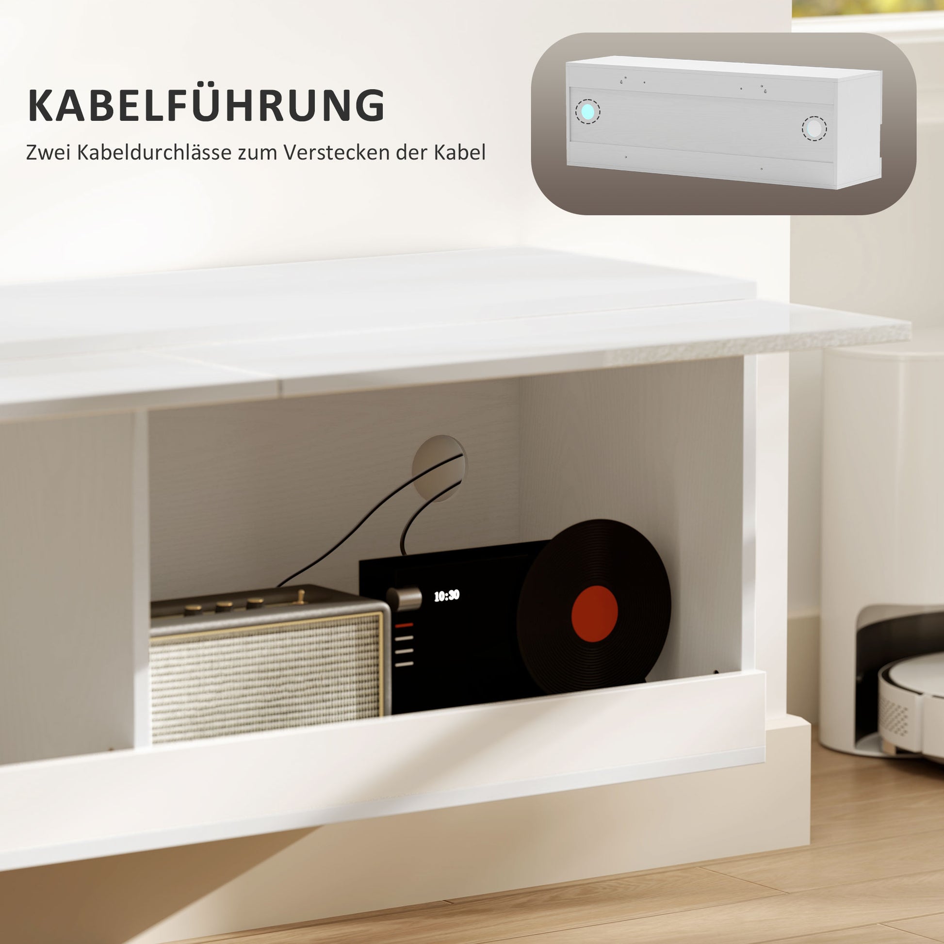 Der wandmontierte HOMCOM TV Unterschrank überzeugt durch sein stilvolles, einfaches und robustes Design. Perfekt für jeden Einrichtungsstil, bietet die Infrarot-Fernbedienung mit 24 Tasten und 16 Modi des TV Lowboards vielseitige Beleuchtungs-Unterhaltung. Zwei Fächer und Kabeldurchlässe der TV Bank sorgen für Ordnung und die Ablagefläche bietet Platz für Monitore bis zu 50 Zoll.