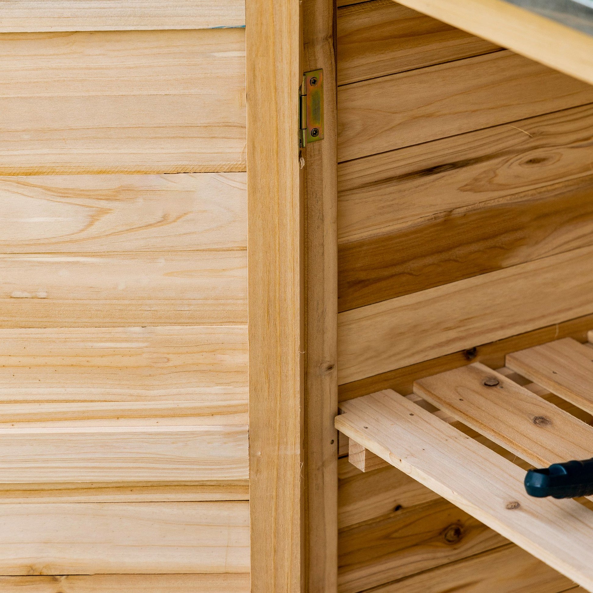 Outsunny Gartenschrank mit 2 Fächern, Metall-Arbeitsplatte mit Aufkantung, Naturholz, 83 x 40 x 92 cm