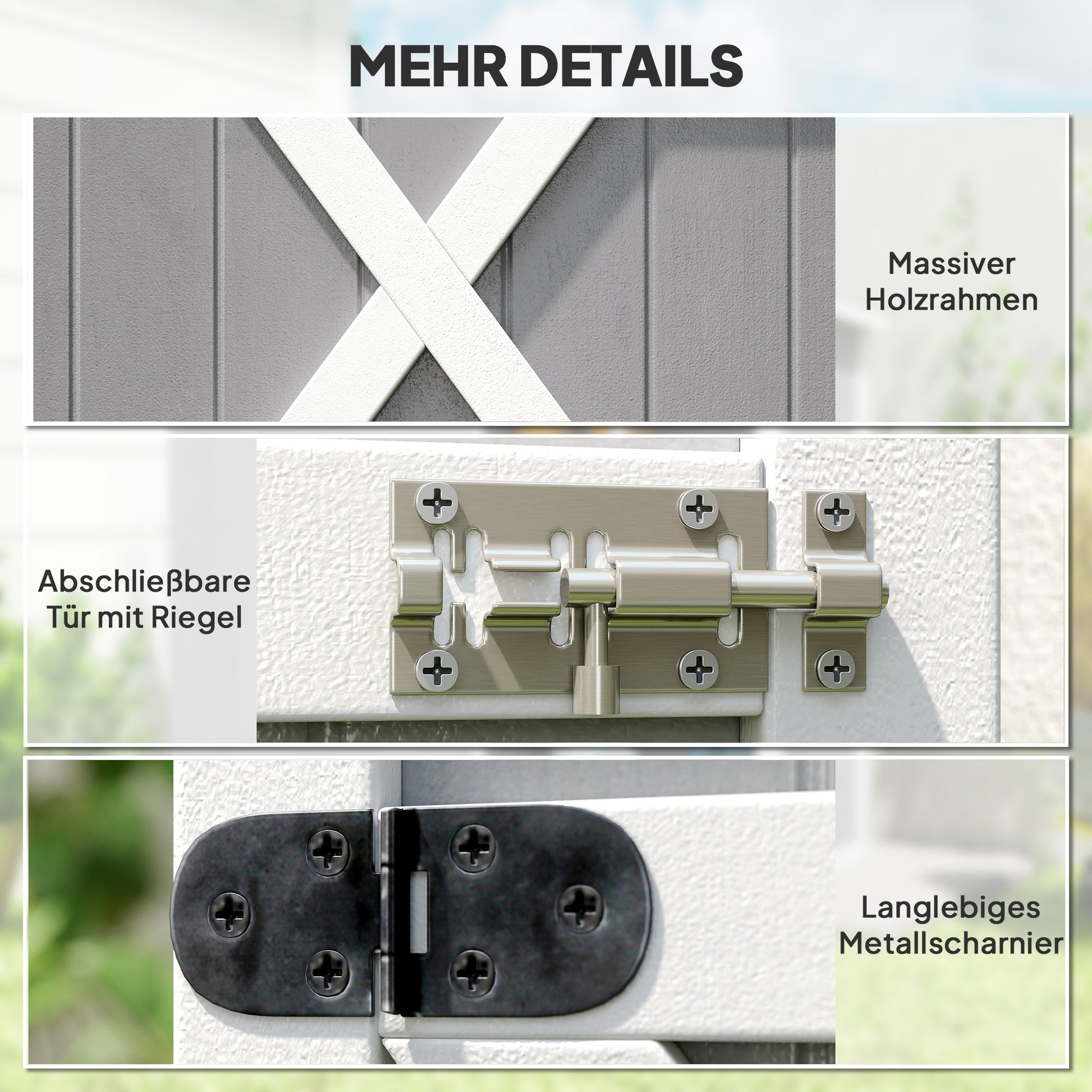 Schaffen Sie Ordnung i Ihrem Garten, mithilfe dieses praktischen Geräteschuppens von Outsunny! Trotz seiner kompakten Konstruktion bietet die Gartenhütte reichlich Platz für unterschiedlichste Geräte und Werkzeuge. Besonders robust gebaut und mit einem wetterfesten Anstrich versehen, wird Ihnen dieser Gartenschrank lange gute Dienste leisten. Das geneigte Dach lässt Regenwasser ungehindert abfließen und die verriegelbare Tür verhindert, dass Tiere eindringen.