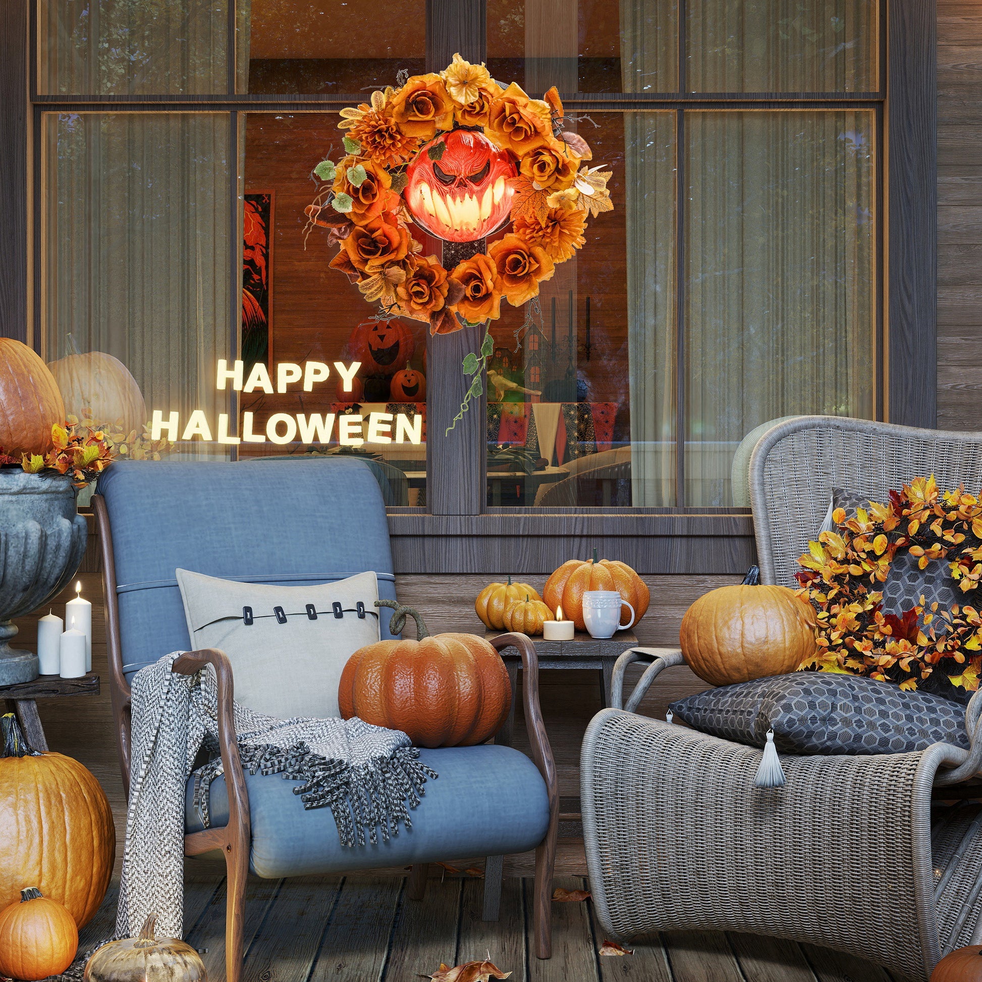 Outsunny Halloween-Kranz, Grusel-Kürbis-Design, Herbstblätter, Lichteffekte, Kunststoff