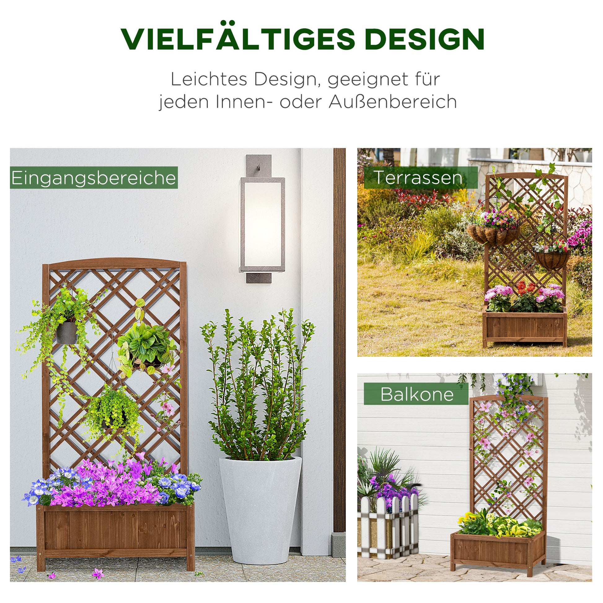Sind Sie ein Blumen- und Pflanzenliebhaber, der jedoch zu Hause nicht genügend Platz hat? Unsere Lösung: Der Blumenkasten von Outsunny mit integriertem Pflanzengitter. Unser Balkon-Hochbeet är inte perfekt för Topfpflanzen, utan bietet auch en ideal Umgebung für Weinreben. Bringen Sie mit unserem eleganten Pflanzkasten Schönheit in Ihren Garten.