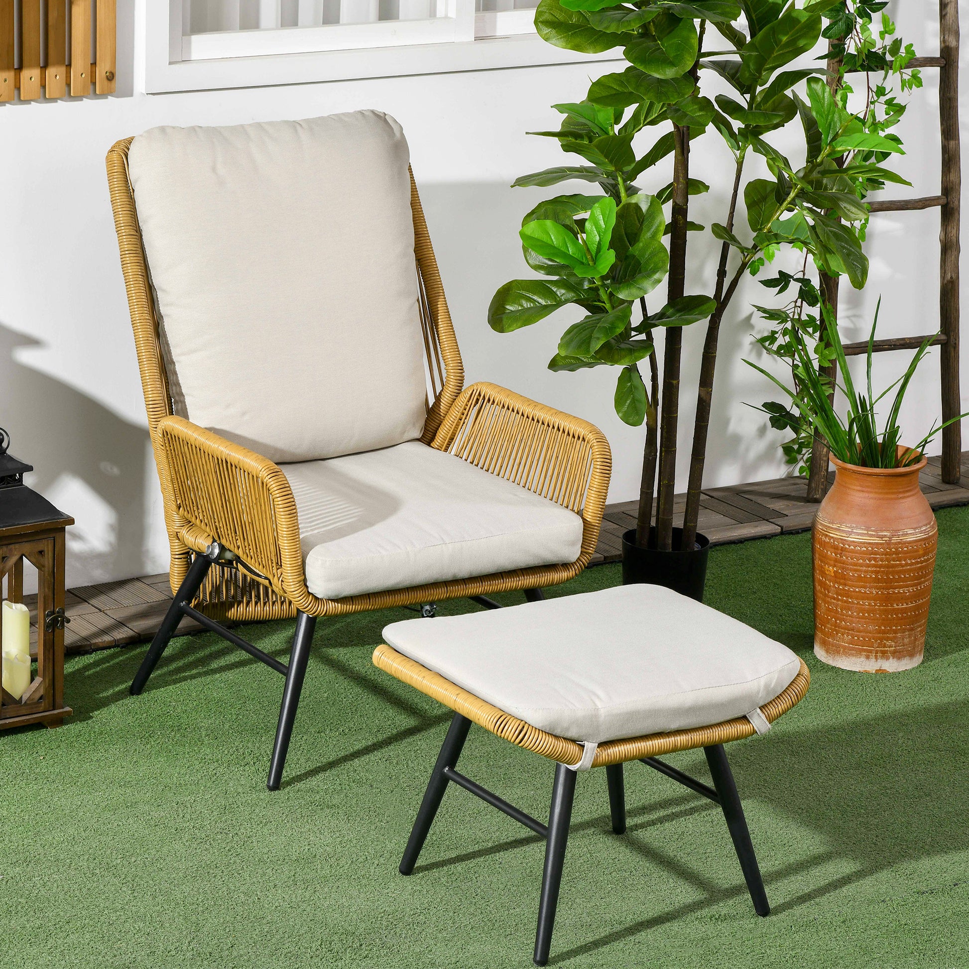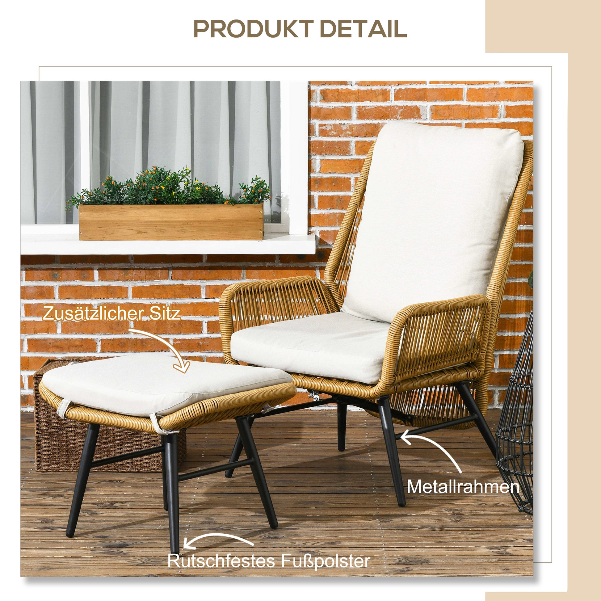 Outsunny Polyrattan Gartenstuhl und Hocker, verstellbare Lehne, Hellbraun/Grau/Schwarz