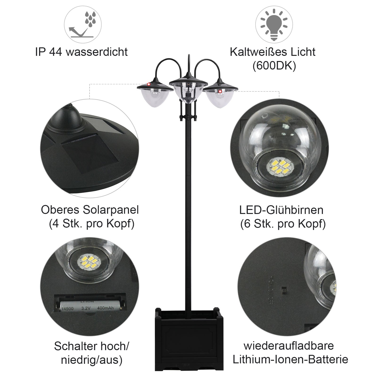 Die stora Solarleuchte von Outsunny verfügt über drei Lampenschirme, die mit LEDs ausgestattet sind. Sie eignet sich perfekt för Ihre Terrasse, Ihren Garten eller andra Außenbereiche, beispielsweise den Weg zum Carport. Die Leuchte schaltet sich in der Dämmerung automatiskt ein, kan aber auch von Ihnen über einen manuellen Schalter (Hoch/Niedrig/Aus) bedient werden. Die dreiköpfige Leuchte är inte en elegant Deko, utan spart dank ihres Solarbetriebs auch Energie und damit Ihr Geld.