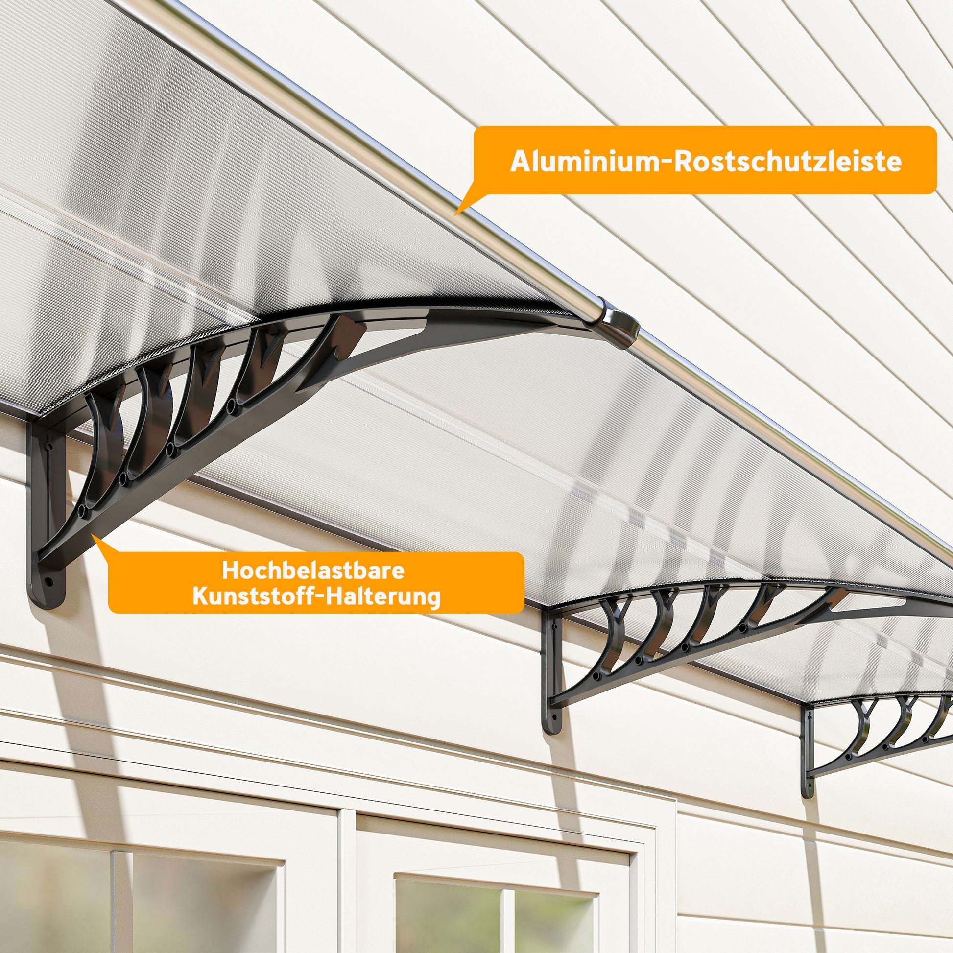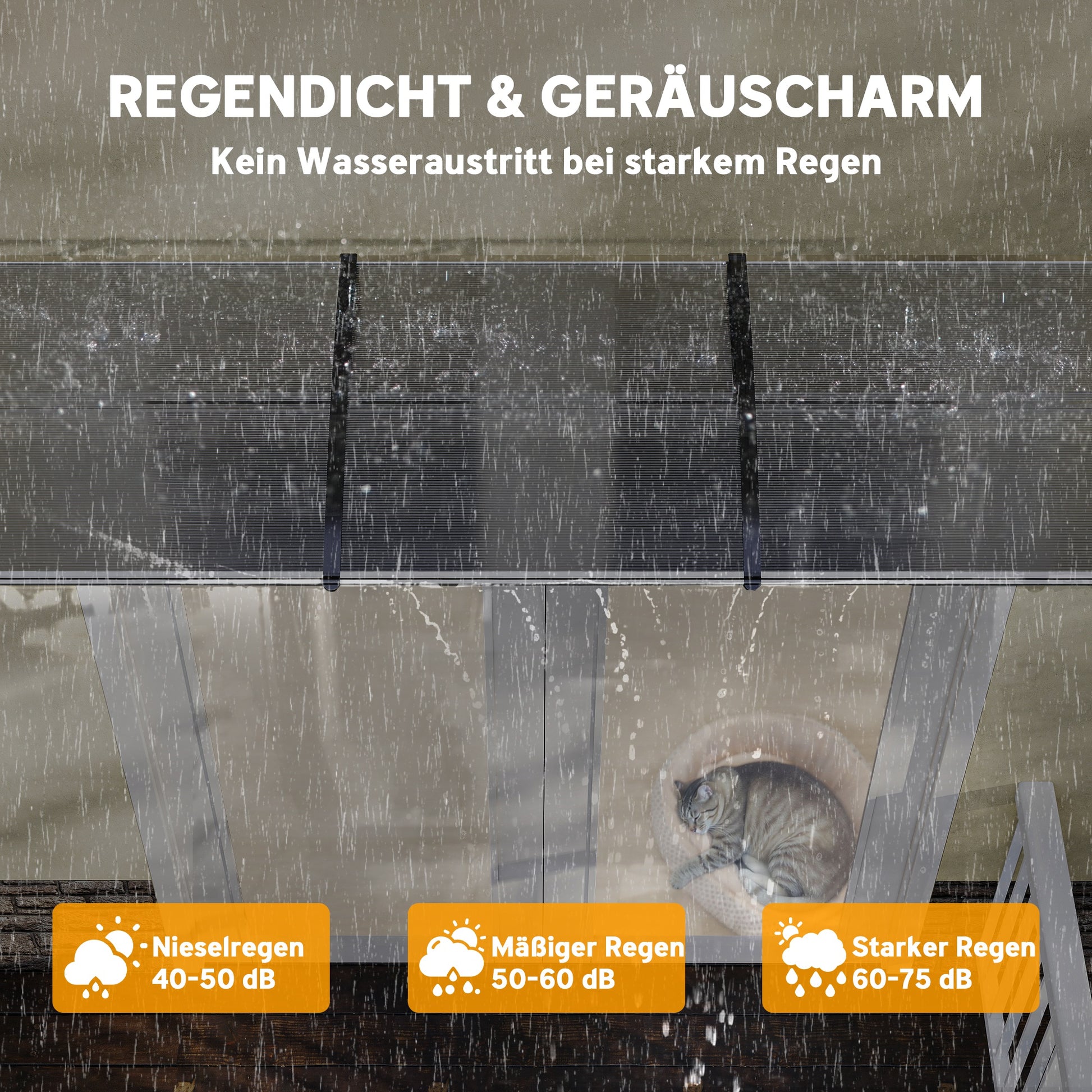 Das geschwungene Design bietet Ihnen einen besseren Schutz. Das Vordach verfügt an den Enden über zwei starre Kunststoffbügel zur Verbindung mit der Wand, wobei leichte Aluminiumstangen die Enden mit den Polycarbonatplatten connecten, um Sie mühelos vor den Elementen to protect. Mit einer UV-Beschichtung auf der Oberseite, die schädliche UV-Strahlen abschirmt und gleichzeitig dazu beiträgt, dass Ihr Haus nicht zu heiß wird, wenn die Sonne hineinscheint.