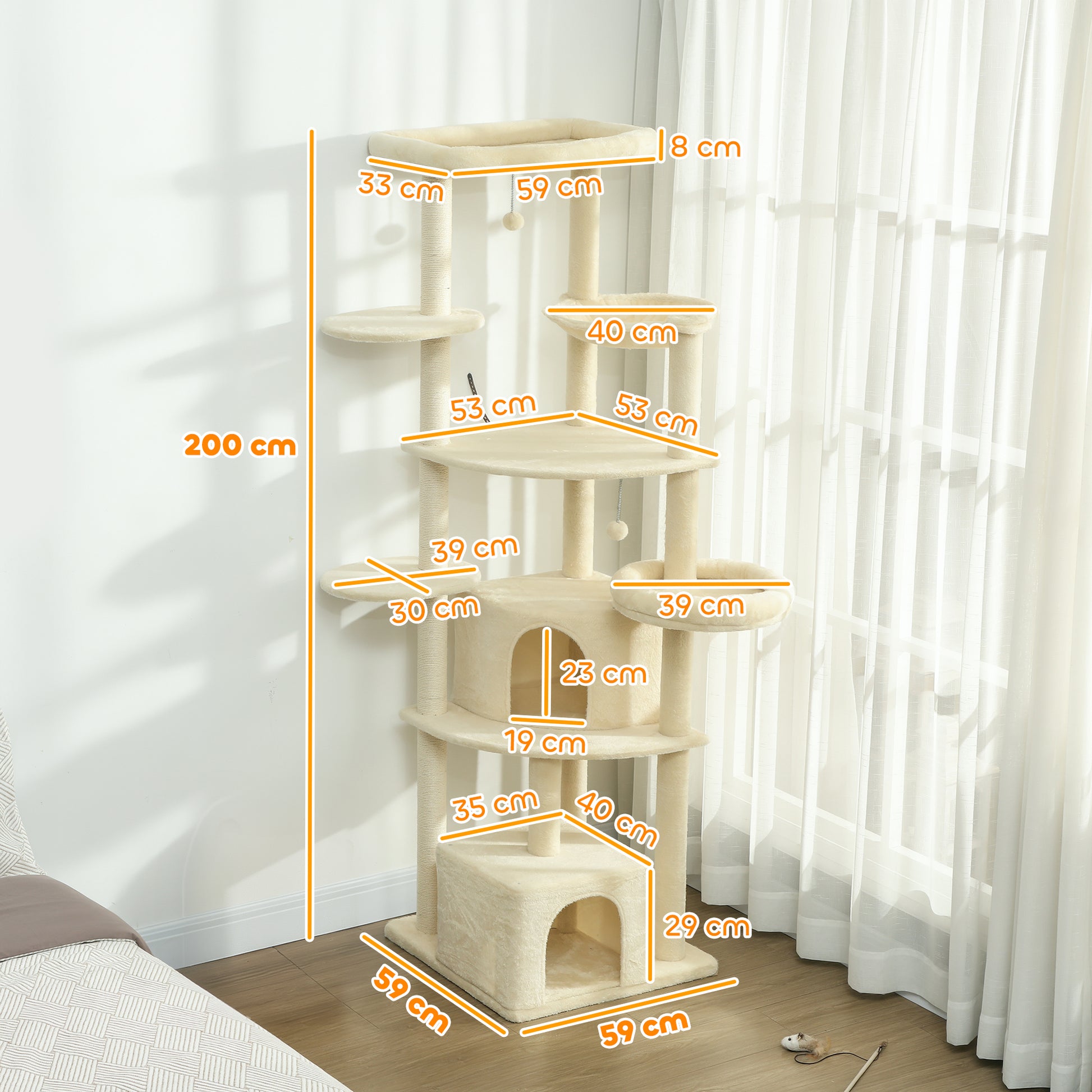 PawHut 2 Meter hoher Kratzbaum für 2-3 Katzen, Kratzpfosten, Höhlen, Hängematte, Verstecke, mehrstöckiges Design, Sisal, Holz, Plüsch, Beige
