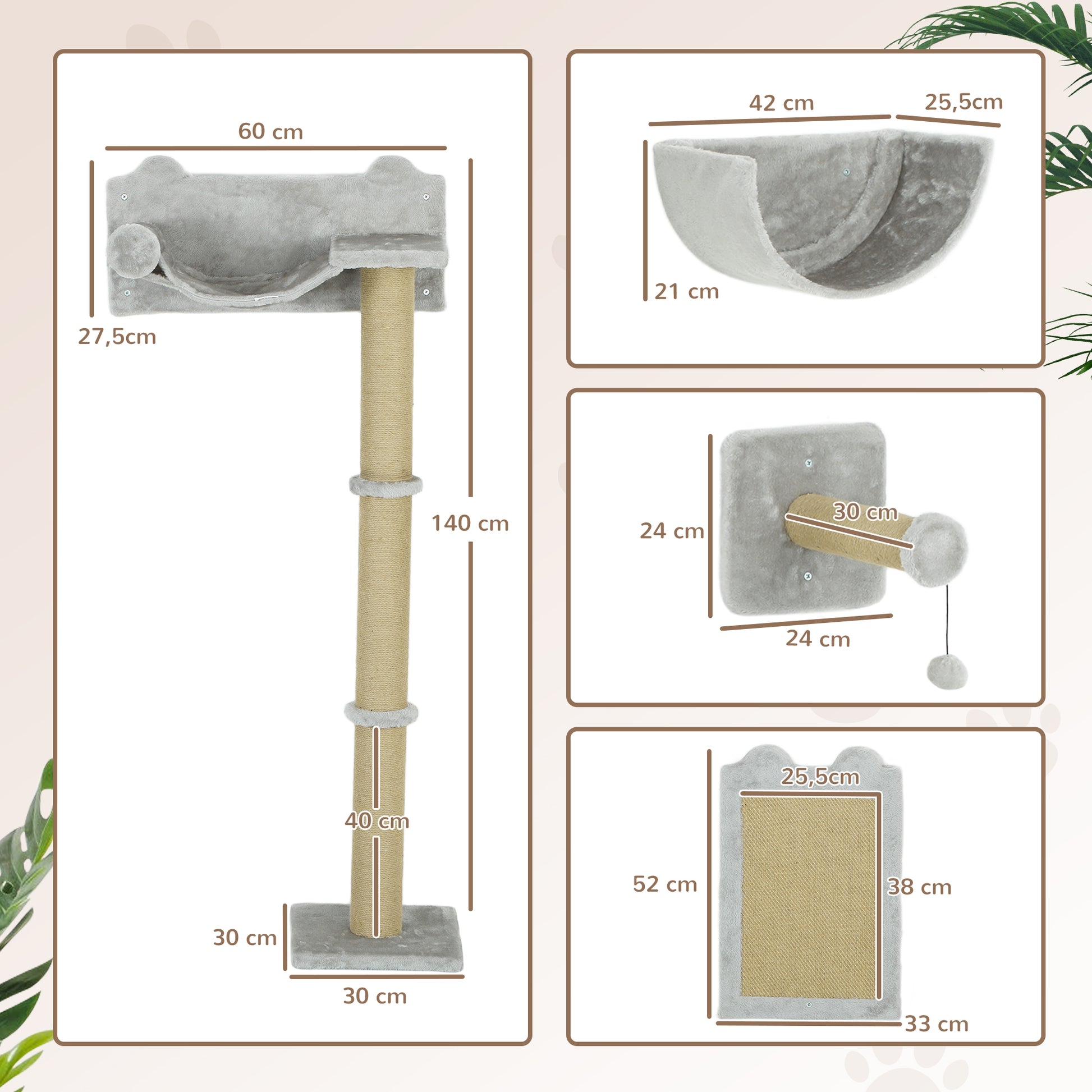 PawHut 5-teiliges wandmontiertes Kletterset für Hauskatzen mit Kratzpfosten, Kratzmatte, Katzenbett, Spielzeugbällen, Hellgrau