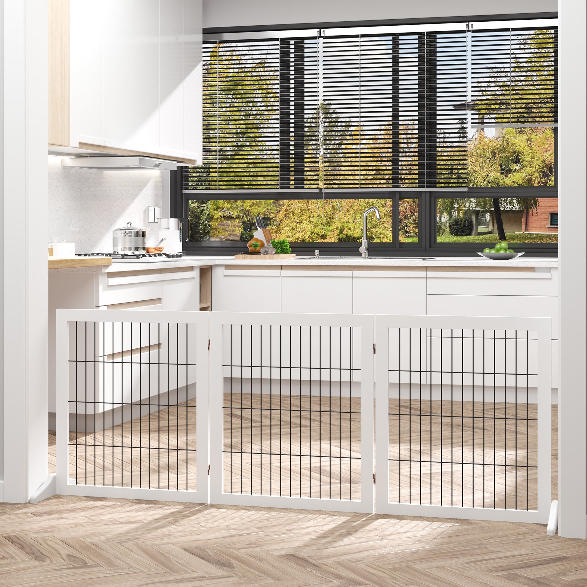 Das PawHut Absperrgitter kan den Auslaufbereich Ihres Haustiers sicher und effektiv einschränken. Die drei durch Scharniere verbundenen Massivholzrahmengitter können in verschiedene Winkel gedreht werden. Sie eignen sich für die Platzierung in engen Gängen, Treppenhäusern oder weitläufigen Bereichen. Wenn sie nicht in Gebrauch sind, können sie leicht zusammengeklappt werden und nehmen nur wenig Platz ein.
