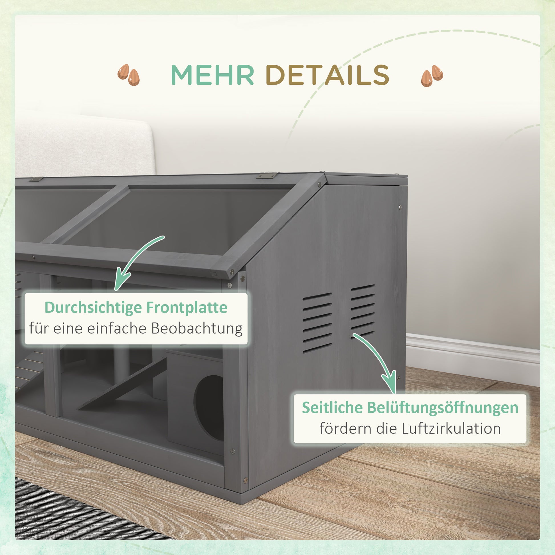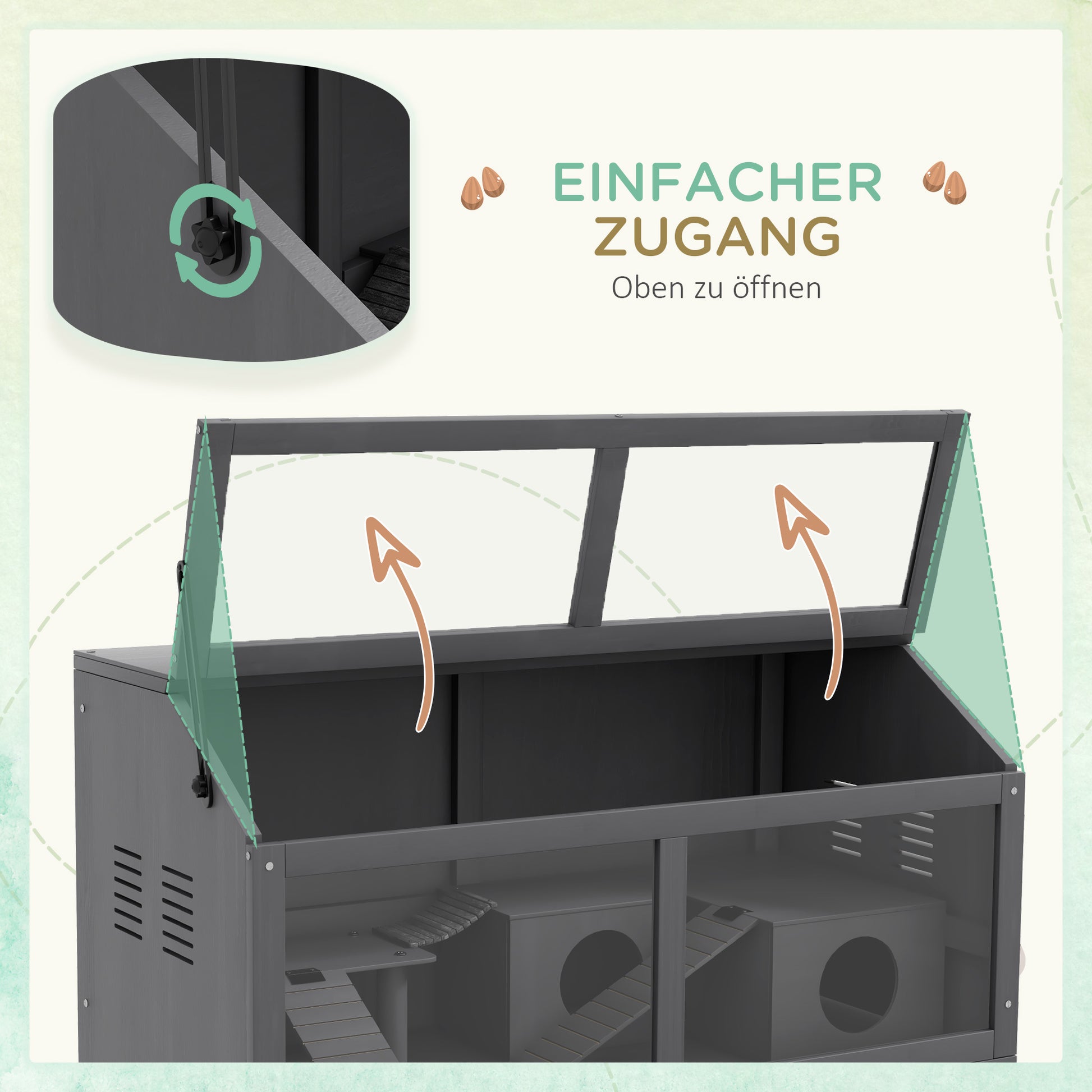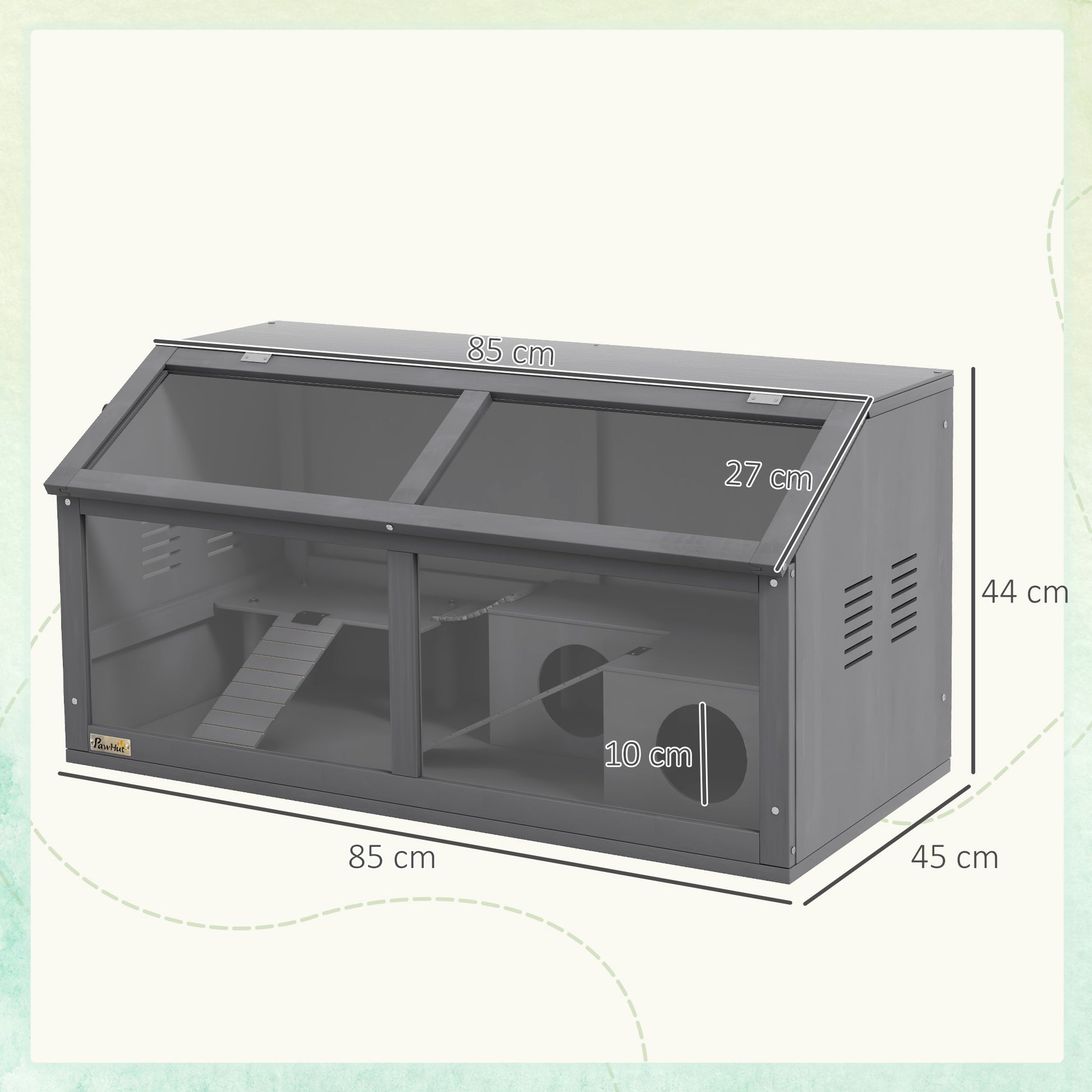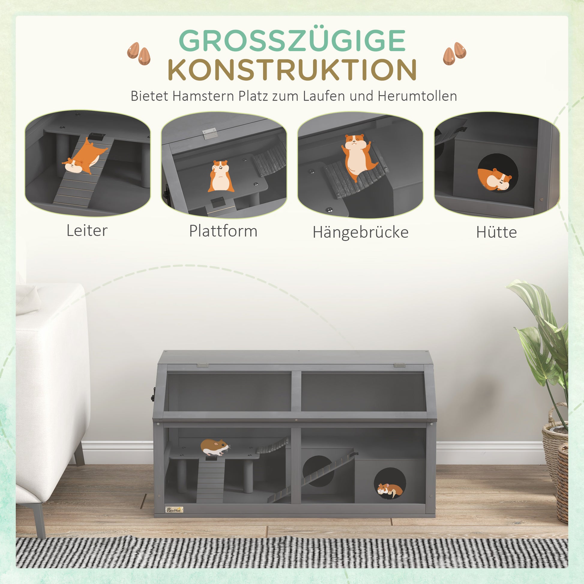 PawHut Hamsterkäfig, Kleintierkäfig aus Holz, Hängebrücke, Leitern, Hütte, 84 x 45 x 44 cm, för Zwerghamster, Grau